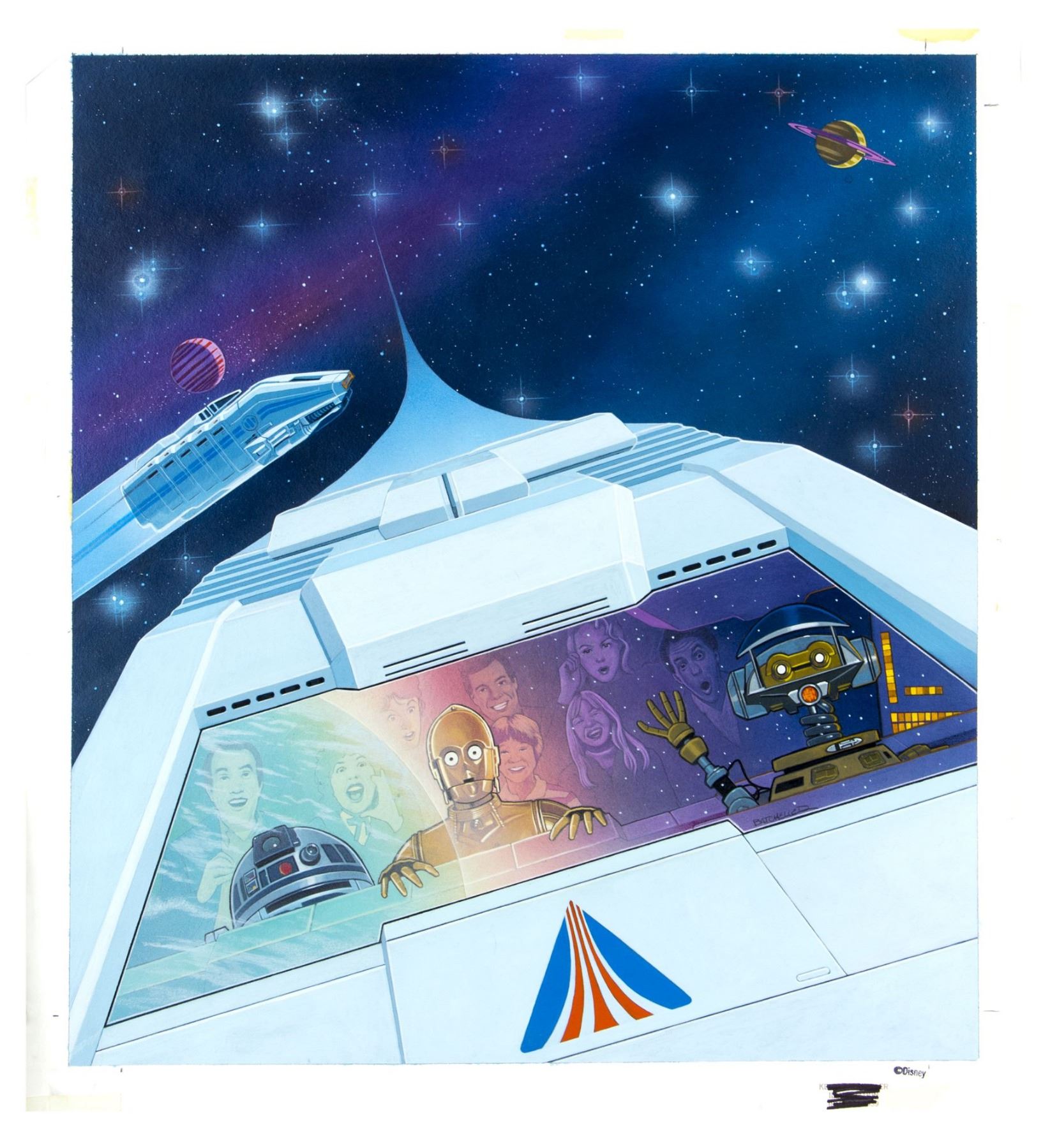 (Disneyland, 1987) An original painting created to promote the newly opened "Star Tours" attraction at Disneyland. The painting was used in print advertisements and prominently features R2D2, C3PO, and Captain Rex. Accomplished in acrylic on artist's paper, the painting features the Disney copyright stamp in the lower-right corner and is signed by the artist below Rex. The painting is taped along the edges to a board backing with a paper protective cover. Measuring 21.5"x20", the artwork is in very good condition with minor edge-wear.