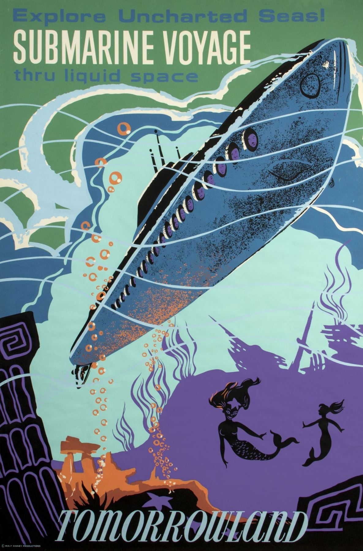 (Disneyland, 1959) A hand-silkscreened poster for the "Submarine Voyage" attraction. Designed by Sam McKim, this poster is another favorite among collectors for its stylized graphics and pleasing color palette. Measures 54â€x36â€. This item is in very good condition with some edge-wear and a wavy quality to parts of the paper. This poster is adhered to a board backing.