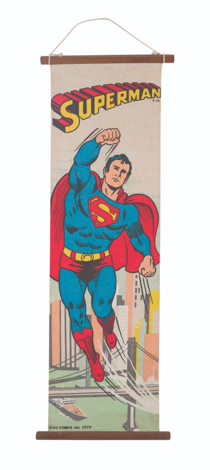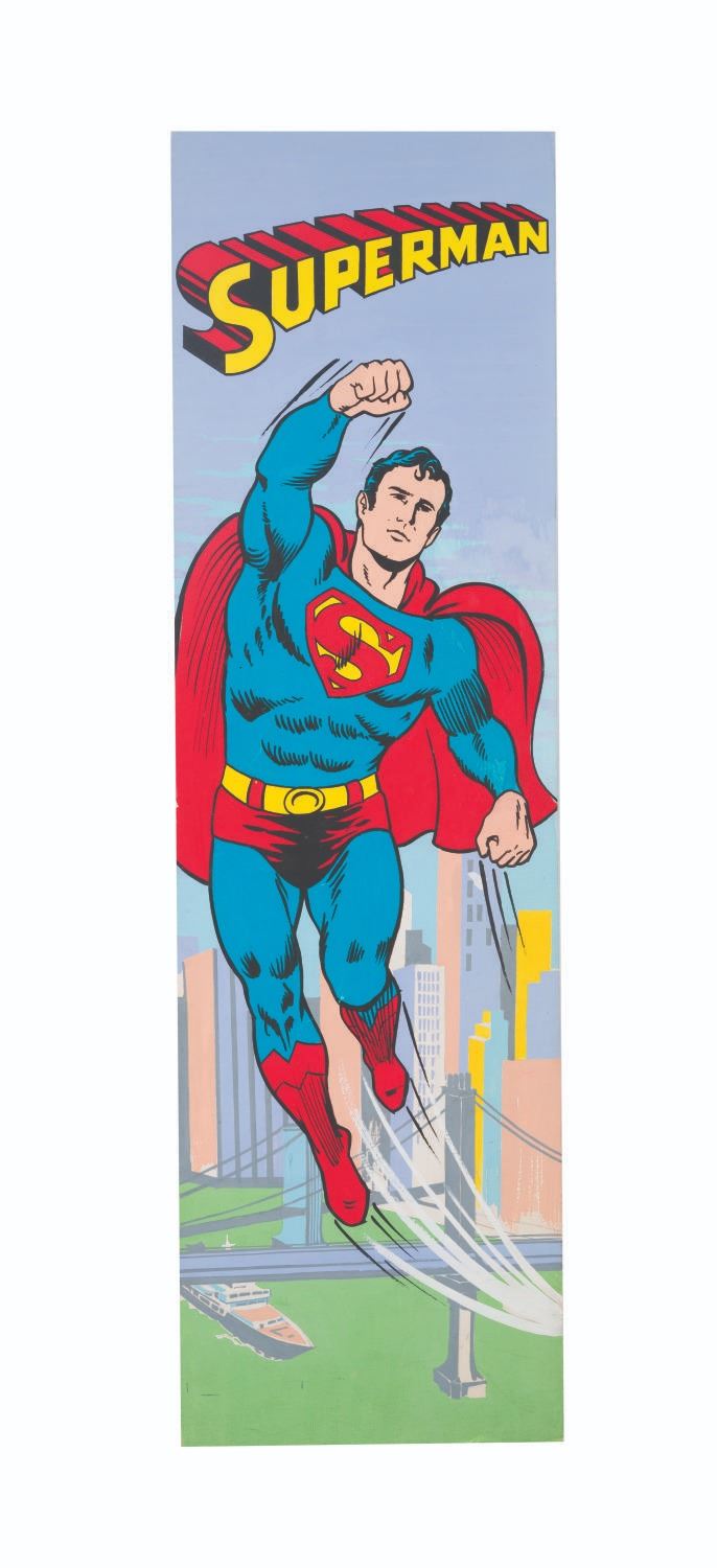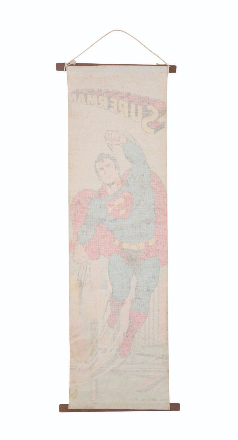 (DC, 1979) Large and impressive original artwork used for a fabric souvenir banner released around the same time as Warner Brothers "Superman: The Movie." Measuring 8" x 27.5", the mixed media artwork displays in very good condition, exhibiting some minor scuffs and margin wear as well as light moisture spotting on Superman's arm. The finished banner is also included.