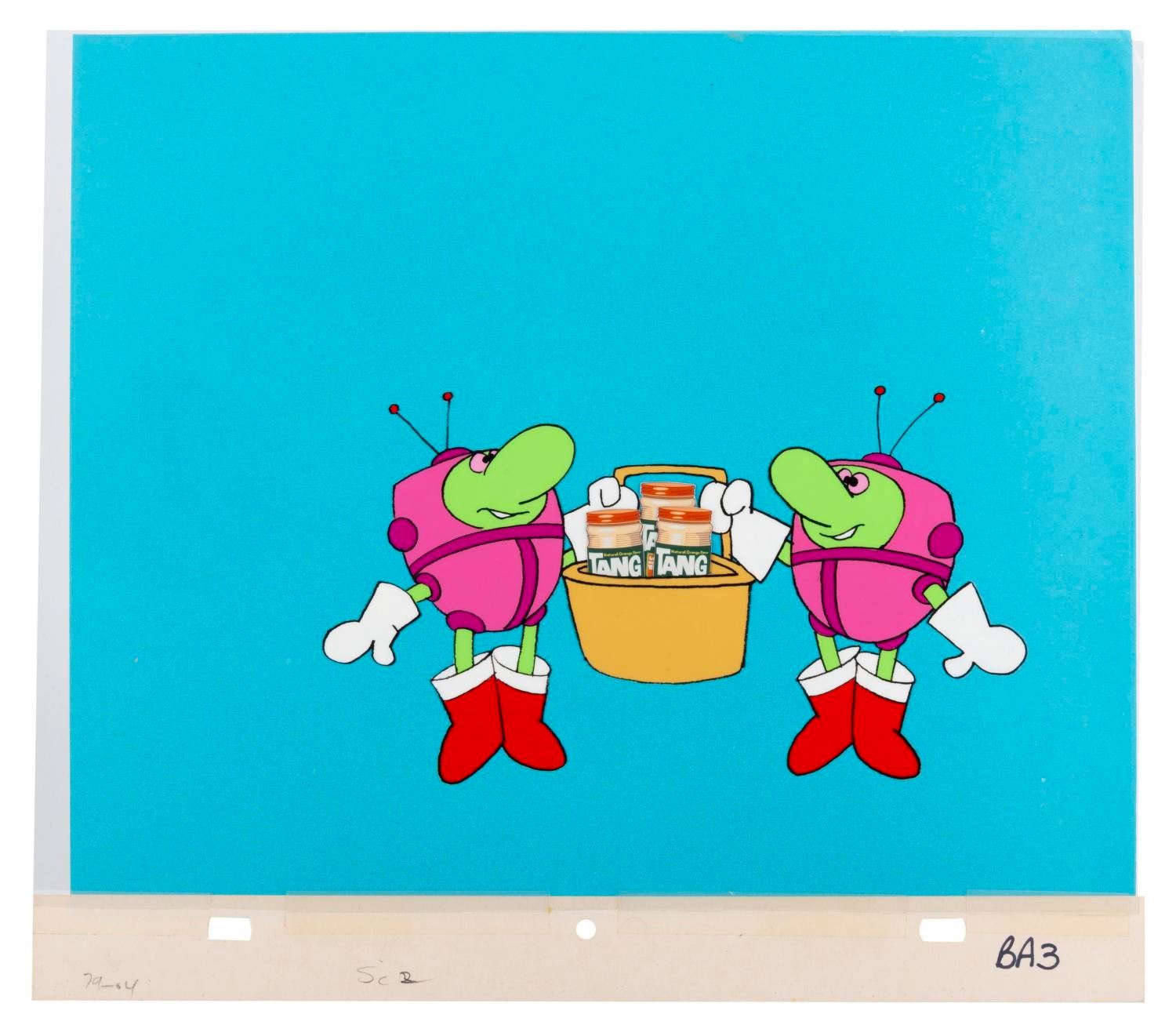 (Tang, 1970s-1980s) A production cel used for a Tang television commercial production. With a character image size of 4.5" x 8" on a 10" x 12.5" cel, the piece displays in very good condition with surface scratches.