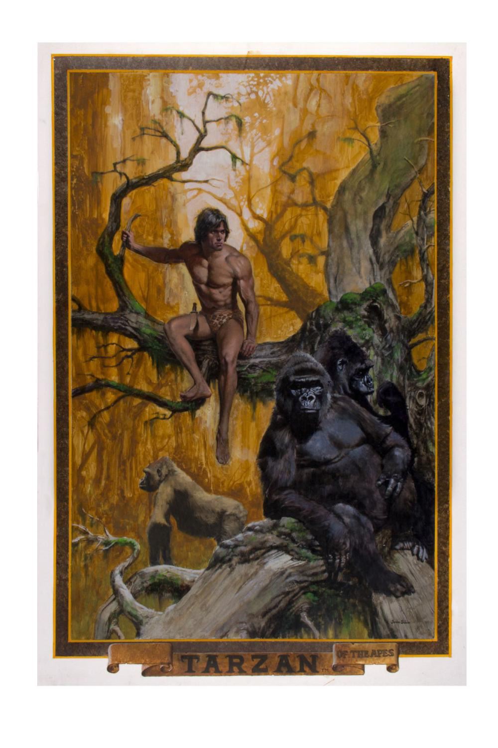 (Thought Factory, 1978) This original painting by renowned poster artist John Solie was used in the creation of a Tarzan themed poster from the popular Thought Factory poster line. The artwork comes from the collection of Bill Wallen, who helped develop and market the Thought Factory posters. Created in acrylic and ink on 40"x27" artist's board, the painting is in very good condition with minor wear.