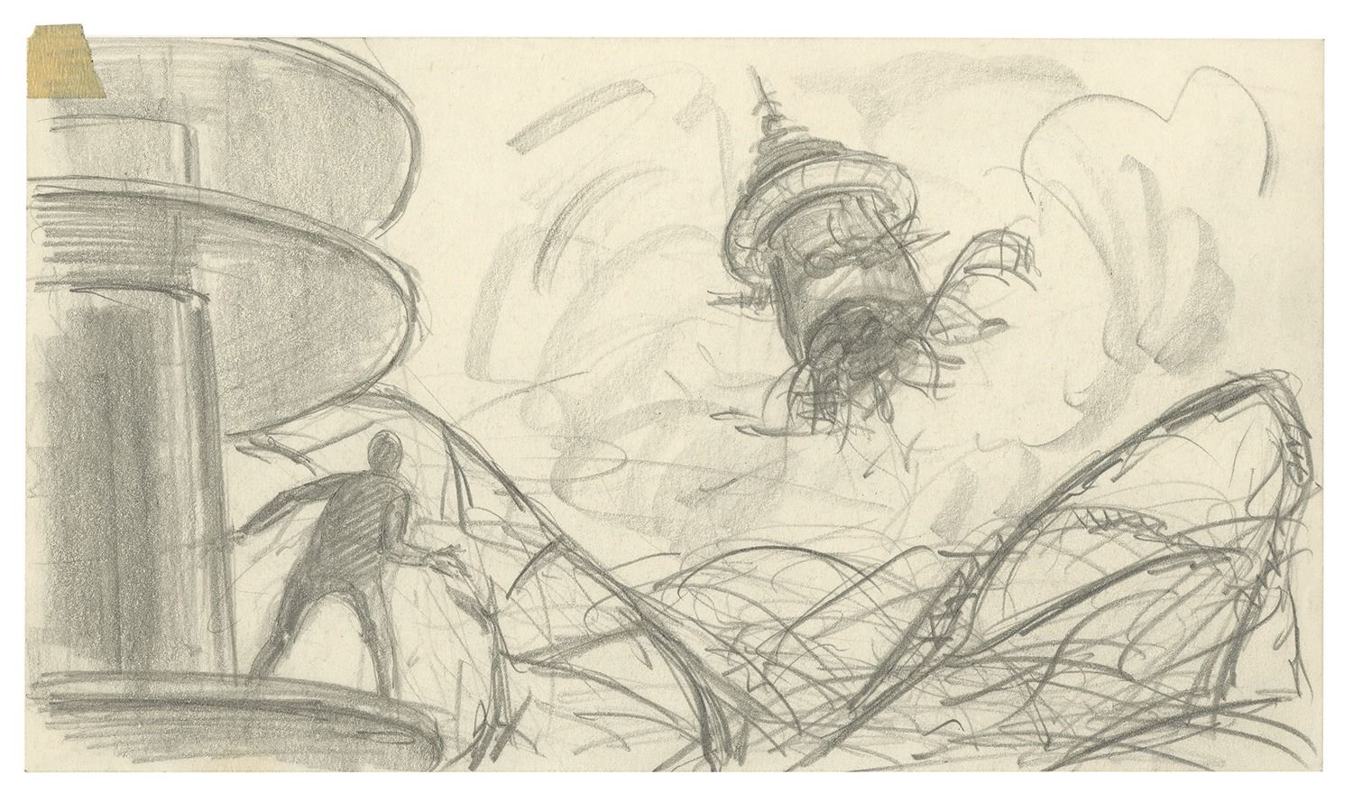 (Disney, 1979) An original concept drawing for The Black Hole. Accomplished in ink and pencil on thin art paper, the concept drawing measures 5"x9" and is in very good condition with minor wear from use, including a small piece of tape in the top-left corner.