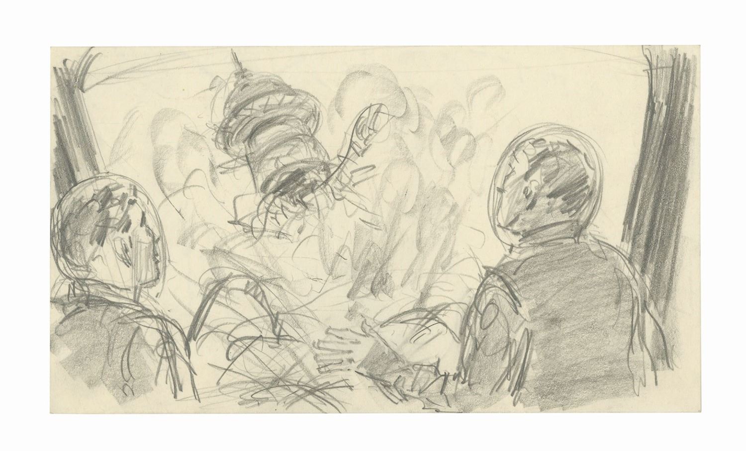 (Disney, 1979) An original concept drawing for the Walt Disney sci-fi feature film, The Black Hole. Accomplished in ink and pencil on thin art paper, the concept drawing measures 5"x9" and is in very good condition with minor wear from use.