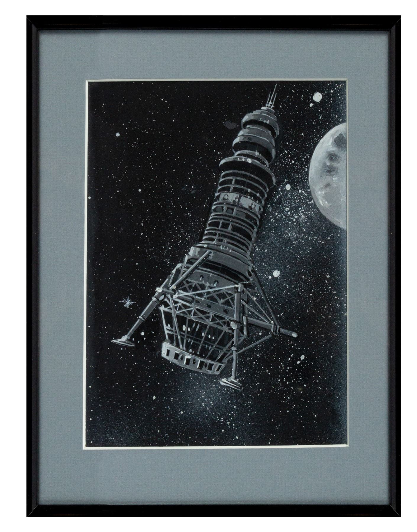 (Disney, 1979) An original concept painting for The Black Hole. The concept has been attributed to Leon Harris, who served as a production illustrator for the film. Accomplished in acrylic, the concept measures 8"x6" in its 11"x8.75" frame. Although unexamined out of frame, the concept appears to be in very good condition.