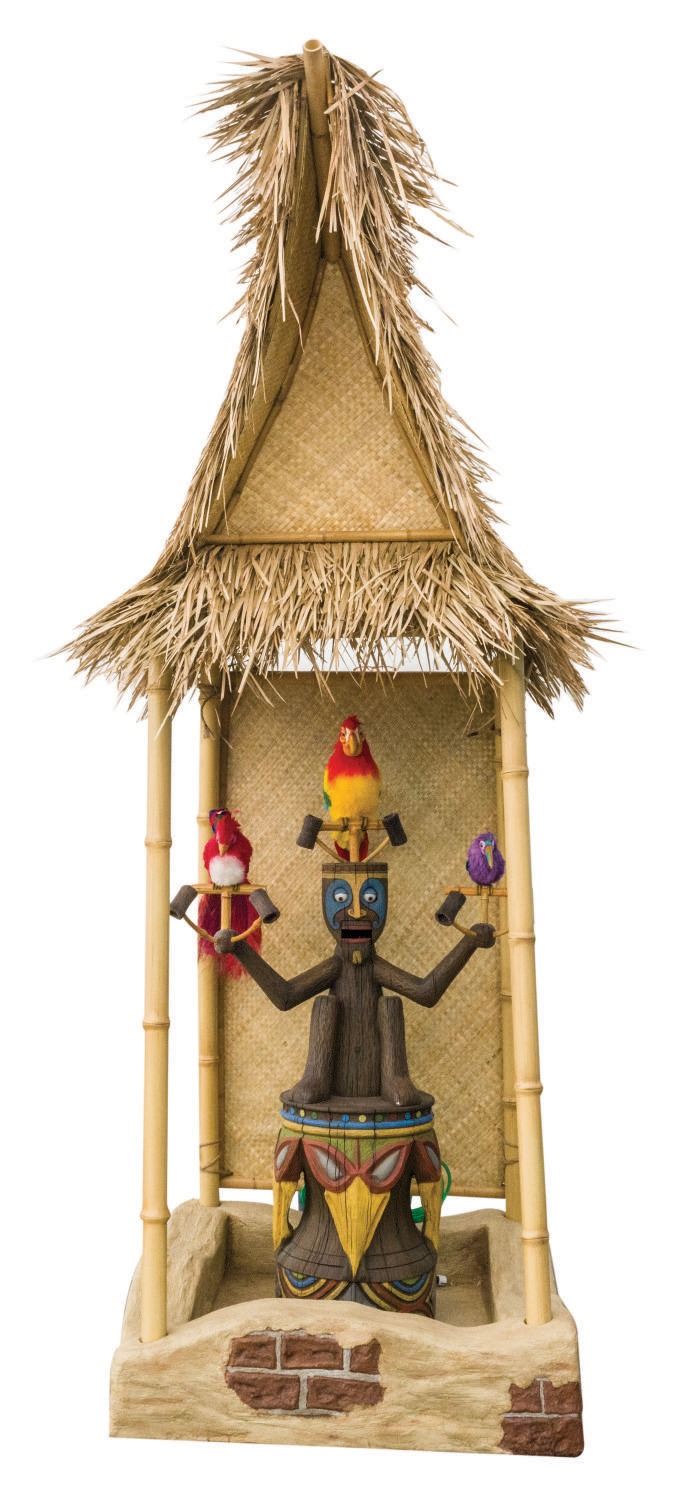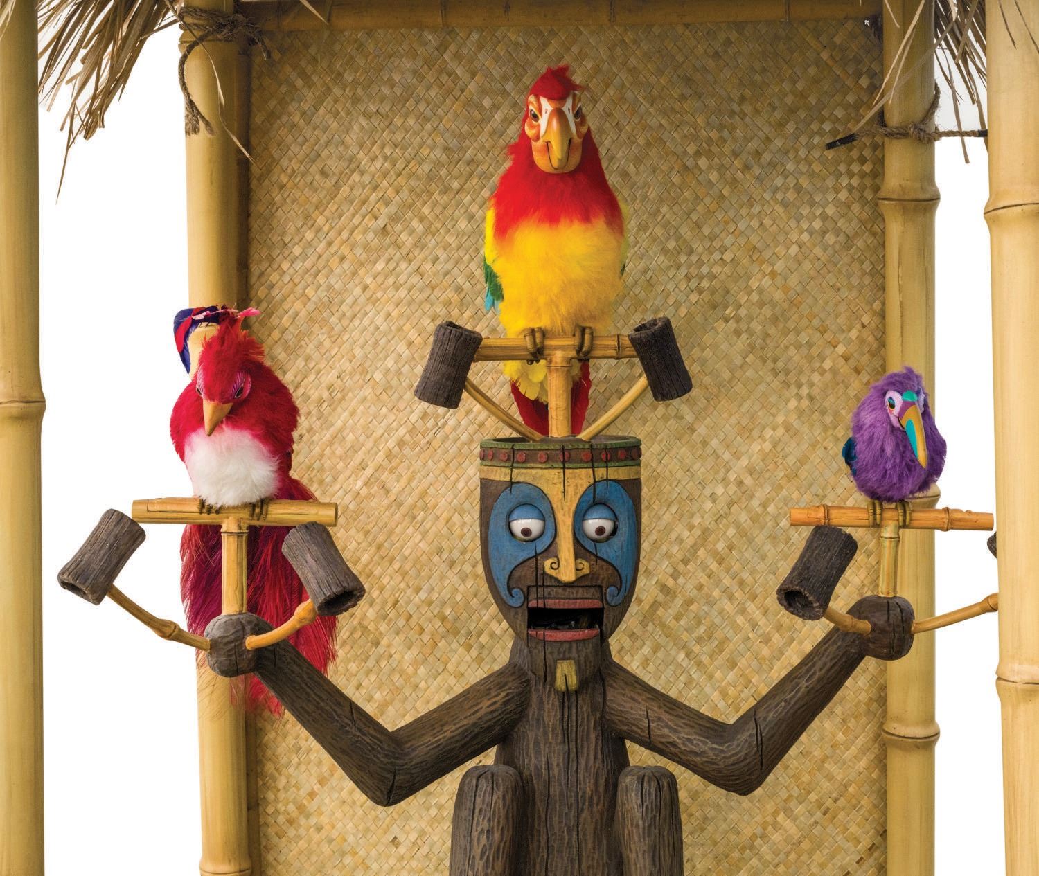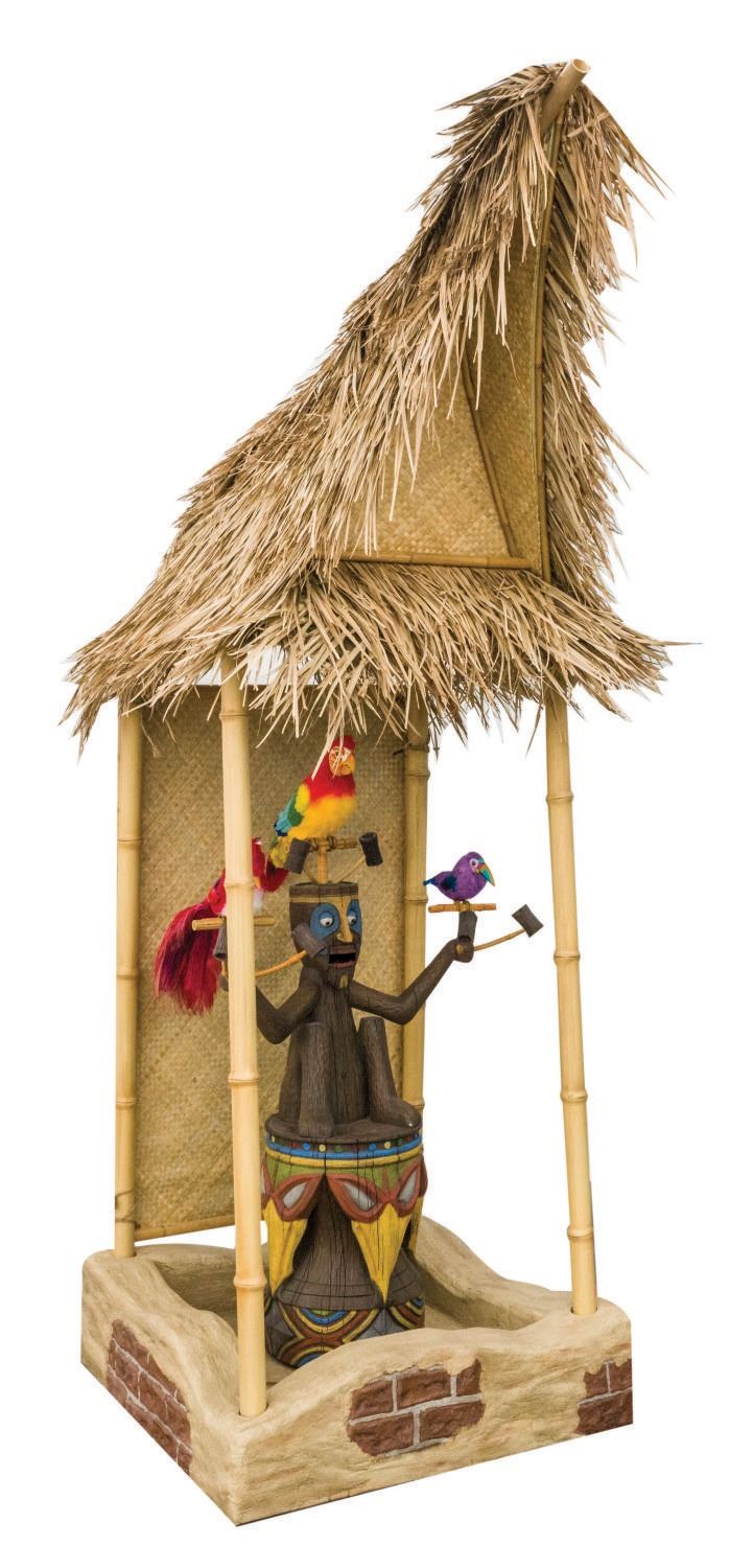 (Walt Disney World, 1980s) A stunning collection of (3) original Park-used Tiki Room Avian Actors, presented on a custom-built and animated Tiki display. Included are Jose with (2) of his back-up birds, who delighted millions of guests at the Enchanted Tiki Room in Walt Disney World. The birds have been restored to working order with their original internal pneumatic switches and animate to "The Tiki Tiki Room", singing and moving in sync to the soundtrack. Jose measures 24" long, the purple bird measures 12", and the pink is 24" long. The tiki stands 53.5" to its highest perch. An optional "tiki hut" display is included and stands roughly ten feet tall. All (3) birds and the display are in Fine condition. This is truly an enchanting, one-of-a-kind piece. Due to size and weight, special shipping arrangements are required. Please inquire before bidding.