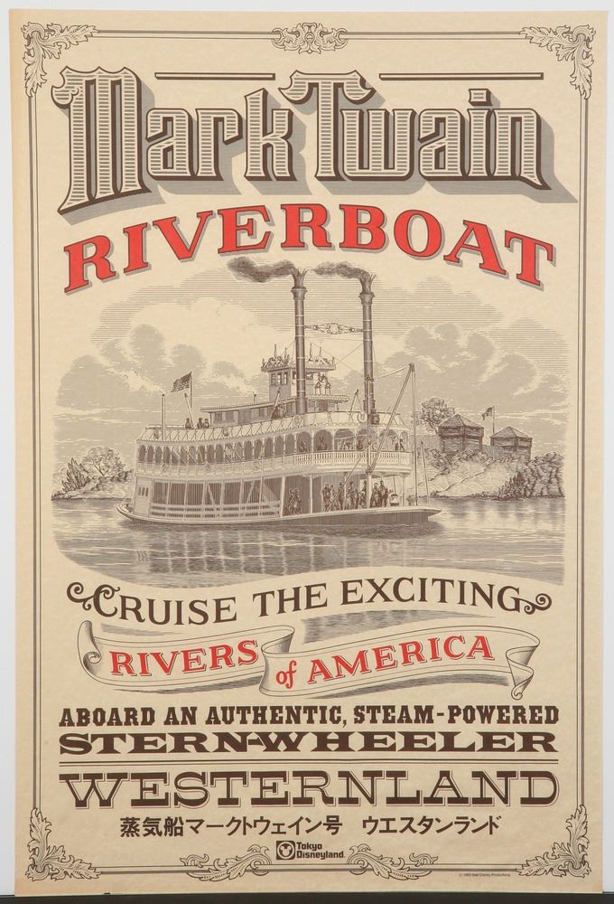 (Tokyo Disneyland, 1983) A rare attraction poster for the Mark Twain Riverboat attraction at Tokyo Disneyland. Prominently reads "Westernland", where the attraction is located. Measures 30"x20". In fine condition with minor edge-wear.