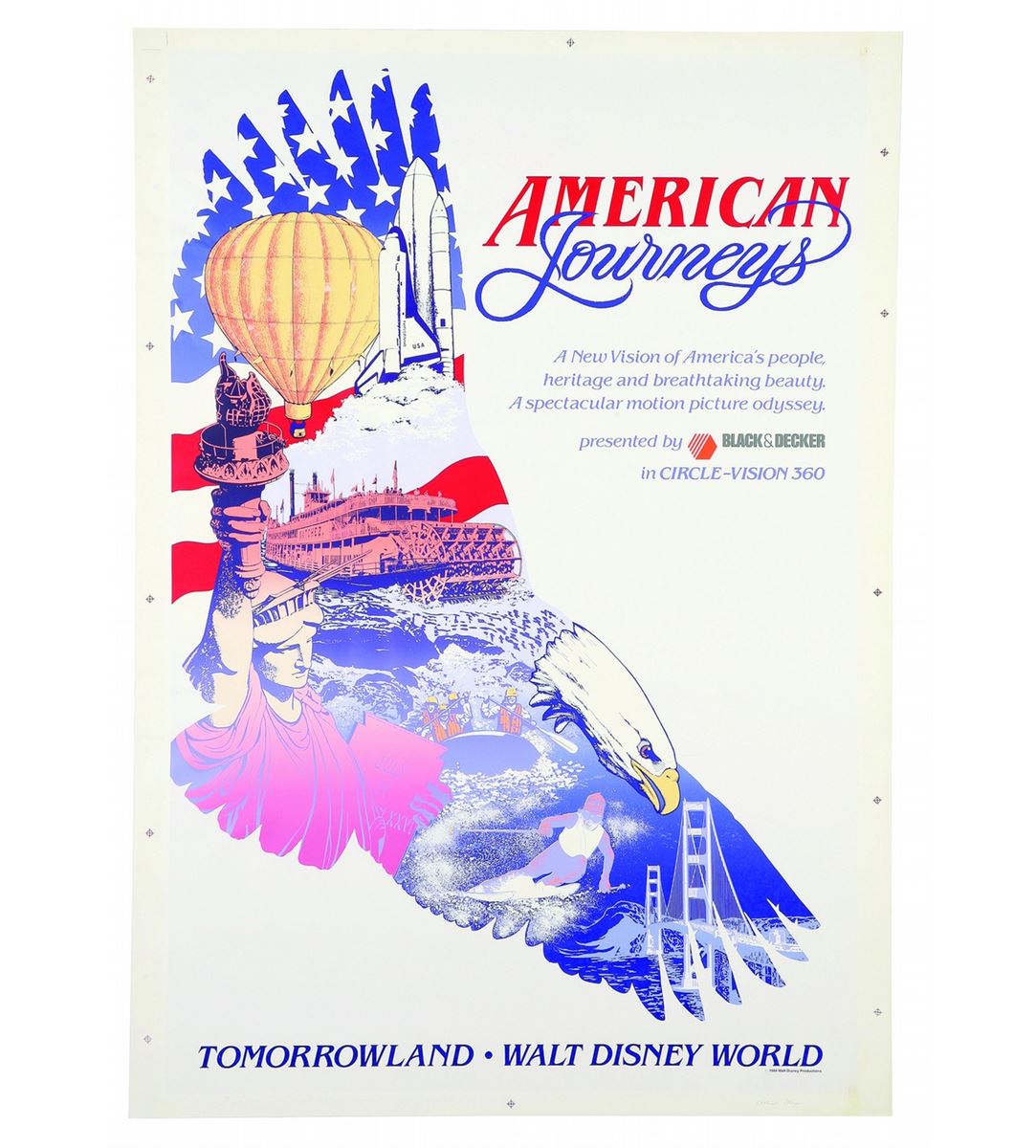 (Walt Disney World, 1984) Original hand-silkscreened poster for the American Journeys attraction at Walt Disney World. This Leticia Lelvier poster design was used for the attraction at Disneyland, Walt Disney World, and Tokyo Disneyland. This particular poster was an artist’s proof for the run, and has “Artists Proof” written in pencil along the lower right margin. Measures 47”x33”. In very good condition with some minor wrinkling and wear.