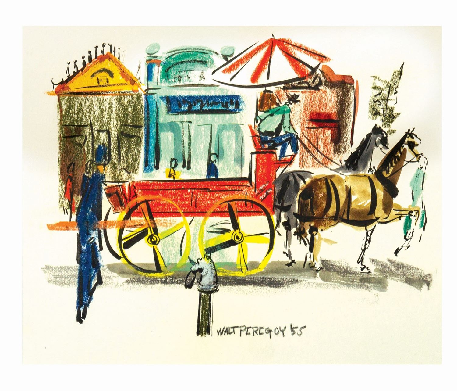 (Disneyland, 1955) An original painting by Disney Legend Walt Peregoy, depicting a scene from Main Street U.S.A. during Disneyland's opening year. Peregoy was a prolific artist who contributed to such animated classics as Peter Pan, Lady and the Tramp, 101 Dalmatians, and The Jungle Book. He also aided in the design of Epcot Center in the late 1970s. This painting, accomplished in water color, pastels, and ink on art board, highlights many familiar aspects of Main Street such as the horse-drawn carriage, police officers, shops, and horse head hitching posts. The painting has an image size of 10.75"x13.25" within a 17"x19" frame. The artwork is in very good condition with minor frame wear. The painting is signed by Peregoy and dated for 1955 in the bottom-right.