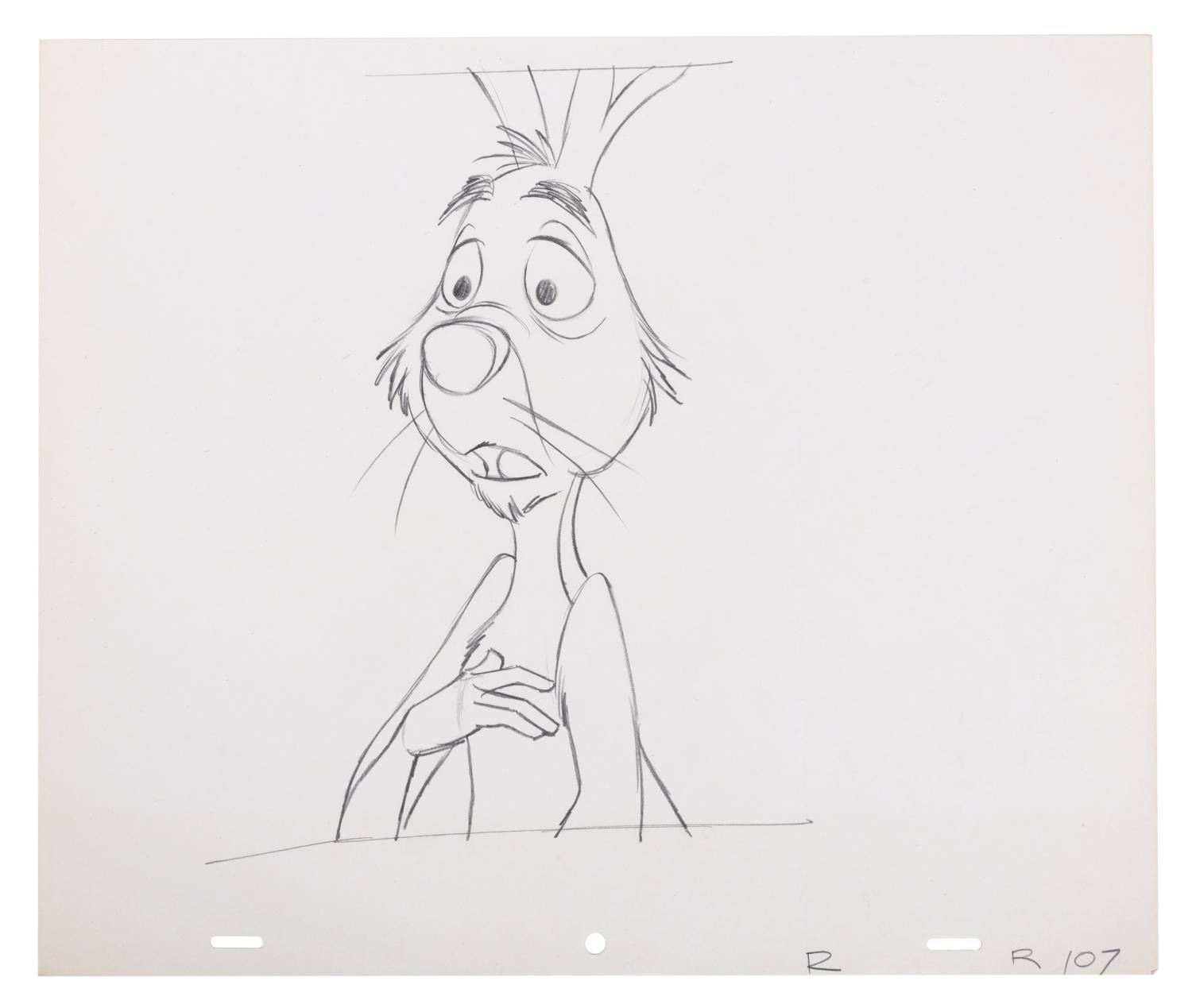 (Disney, 1983) A Rabbit production drawing that may have been prepared for a sequence of Winnie the Pooh and a Day for Eeyore. The drawing has an image size of 4”x9” on its 12.5”x10.5” paper and is in fine condition.