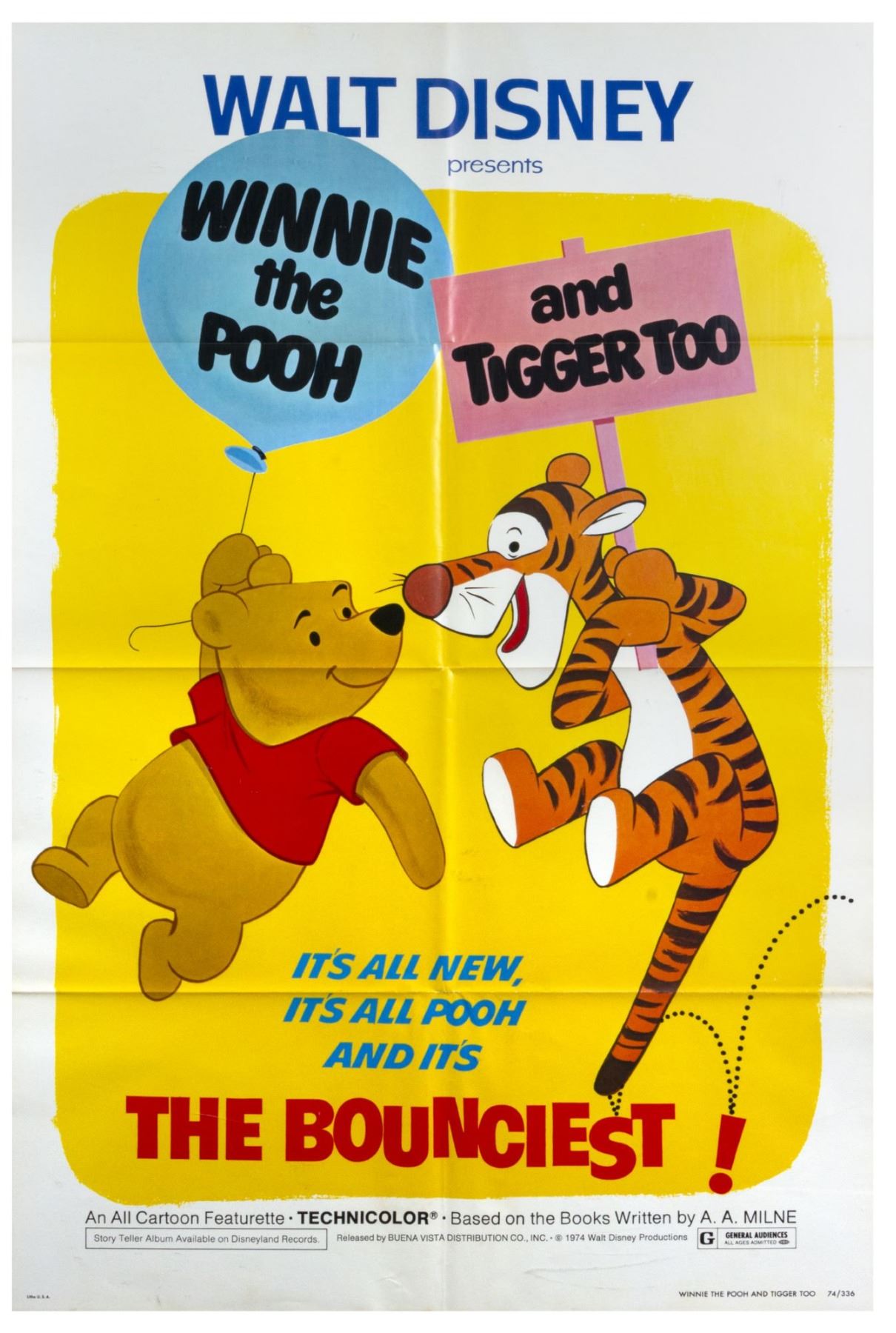 (Walt Disney Studios, 1974) A rare poster from the original theatrical release of Winnie the Pooh and Tigger Too. This beautifully illustrated poster depicts both Pooh and Tigger in vivid color. Measuring 41"x27", the poster is in very good condition with minor wear to the fold lines and edges.
