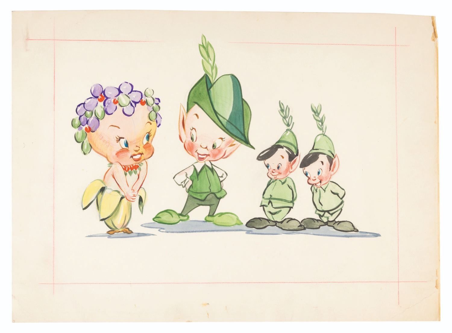 (Schlesinger, 1940s) Original artwork for proposed new Juicy Fruit, Spearmint, and Doublemint characters for Wrigley’s gum advertisements. Accomplished in mixed media, the art has a character image size of 7.25” x 11” on 11” x 15” art paper and is in very good condition with light spotting, handling wear, and a 2.5” crease to the lower right corner.
