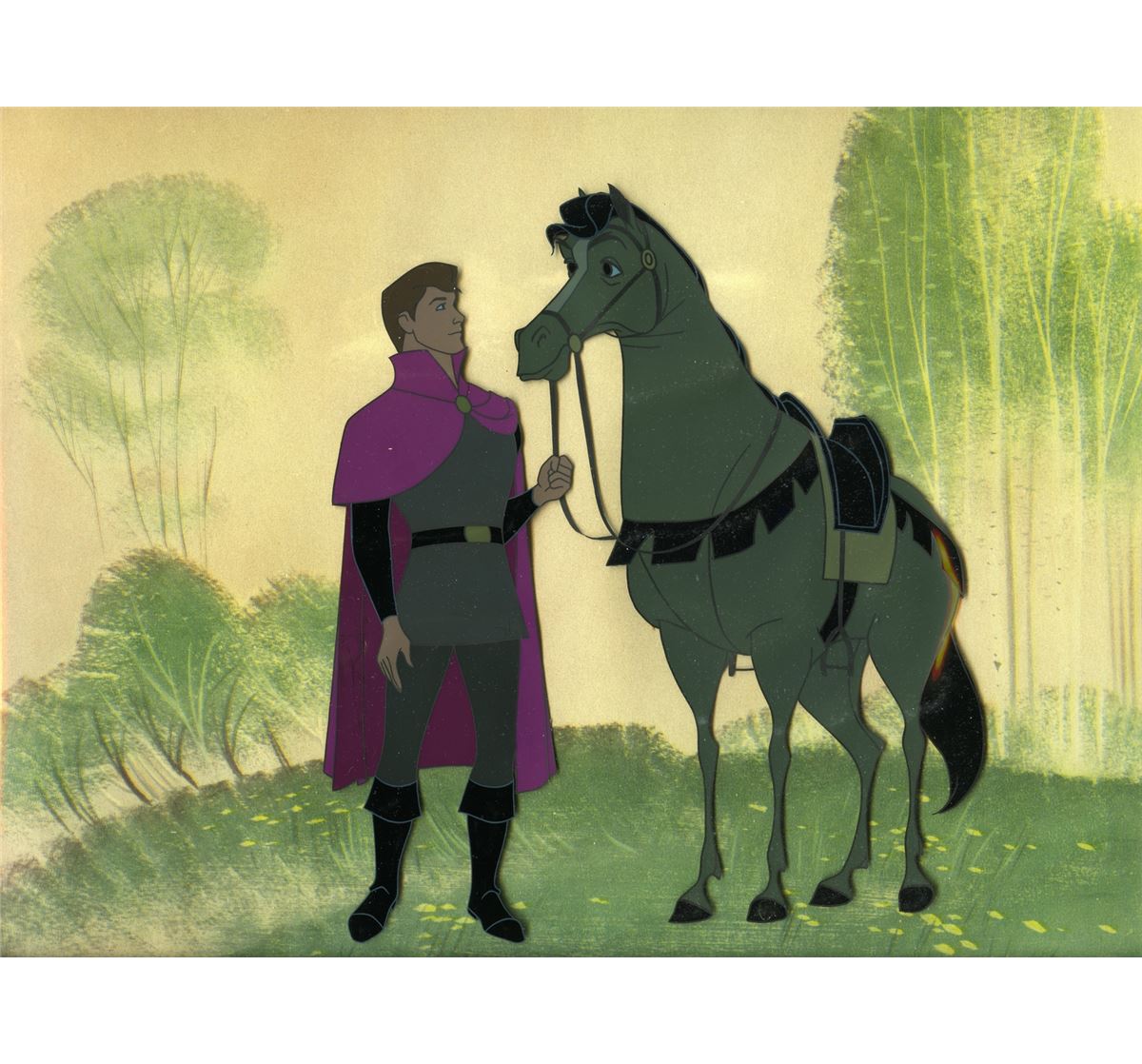 (Disney Studio, 1959) Original production cel of Prince Phillip with Samson from “Sleeping Beauty”. The cel has been trimmed to 9 x 12 in. and stapled to a printed background as prepared for sale at the Art Corner in Tomorrowland. The Disneyland gold label is on the reverse. In very good condition with some light lifting in Prince phillip’s legs.