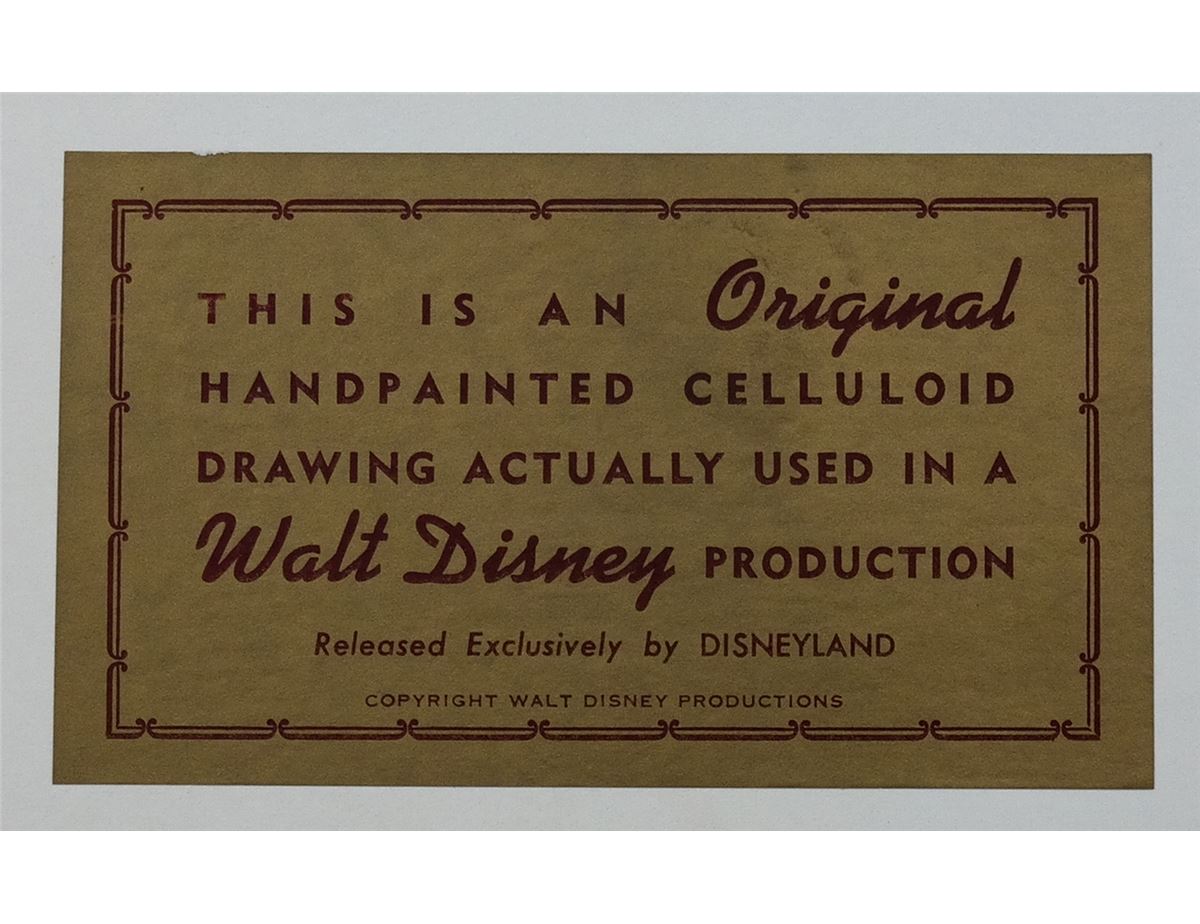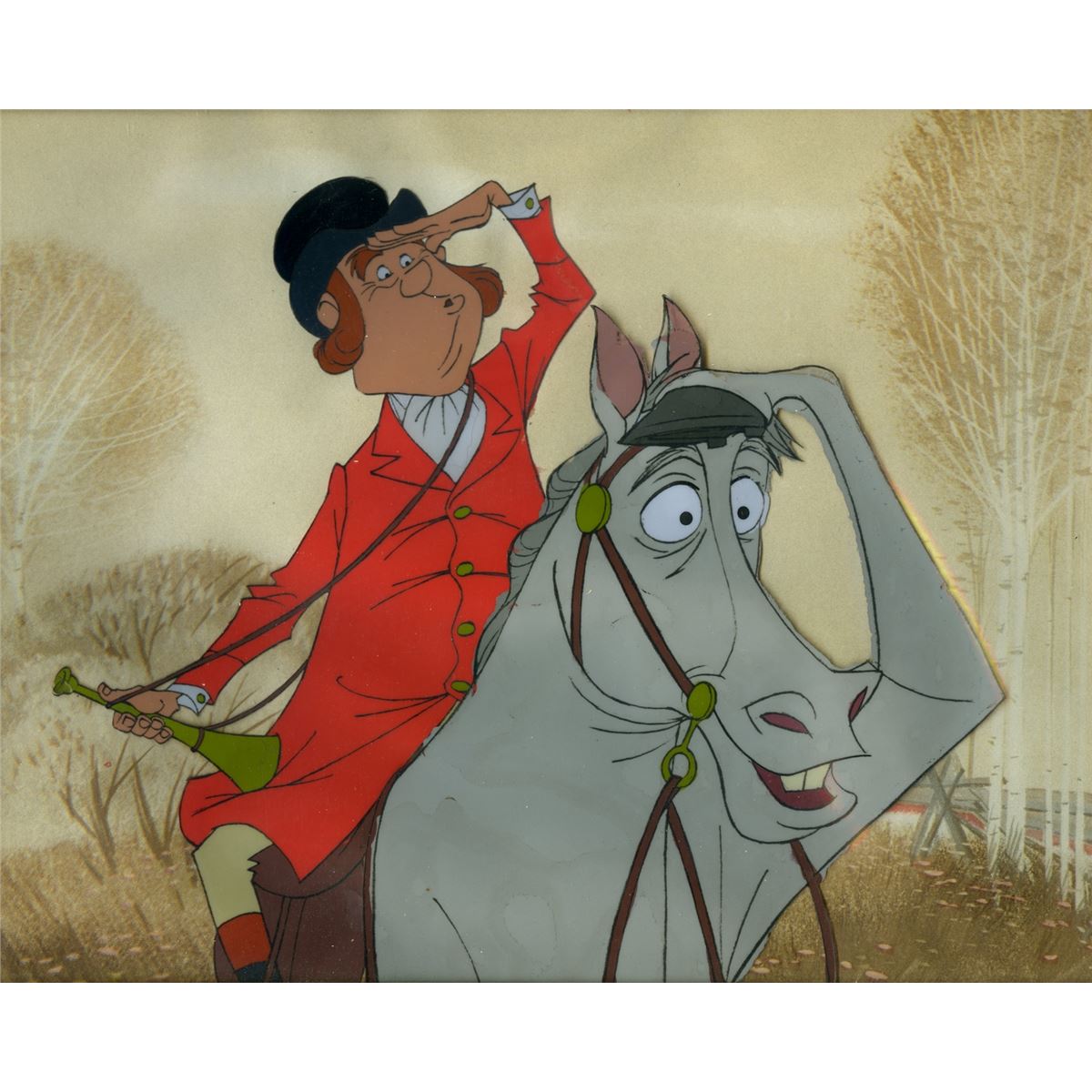 (Disney Studio, 1964) Original production cel of one of the fox hunters from “Mary Poppins”. The cel has been trimmed to 9 x 12 in. and stapled to a printed background as prepared for sale at the Art Corner in Tomorrowland. The Disneyland gold label is on the reverse. In very good condition.