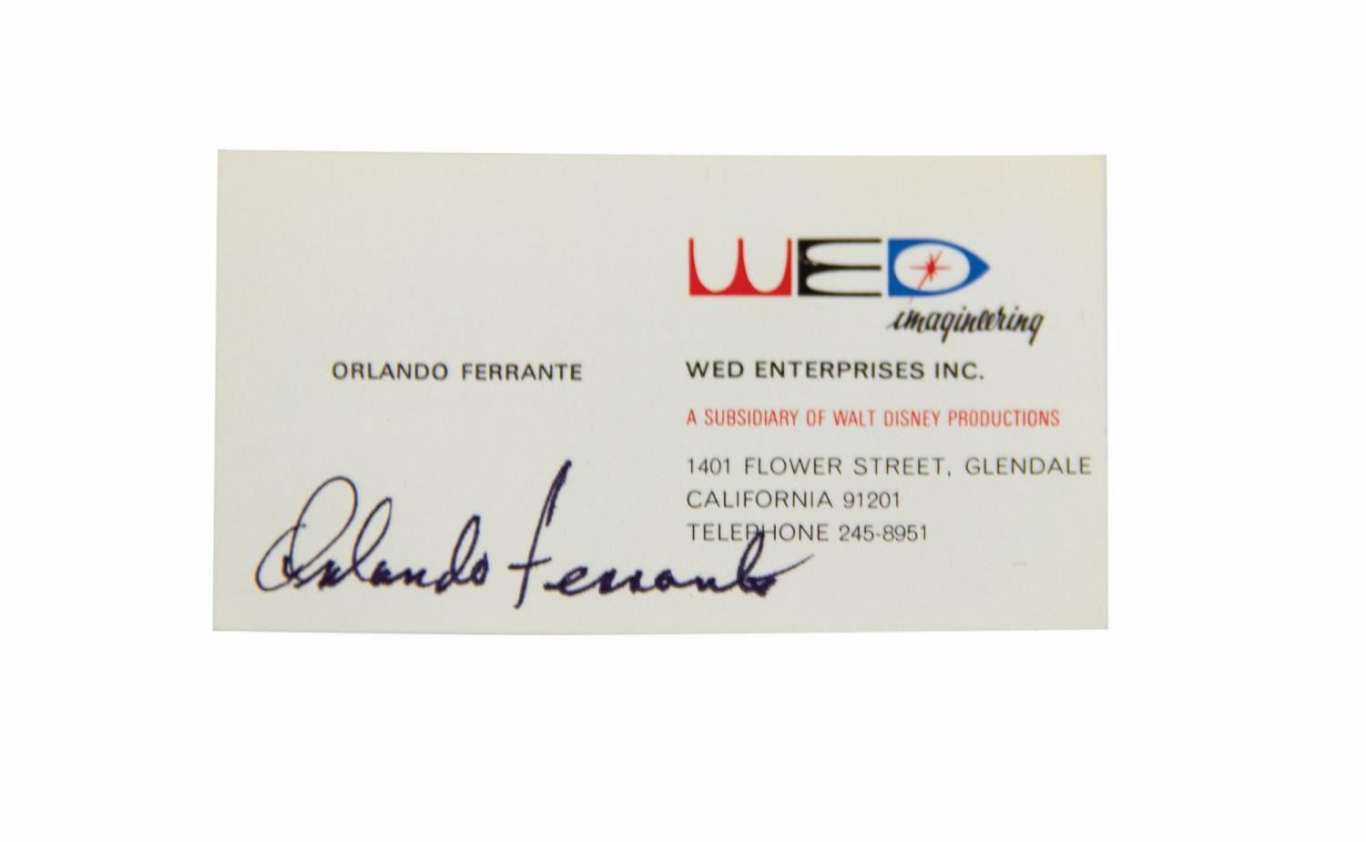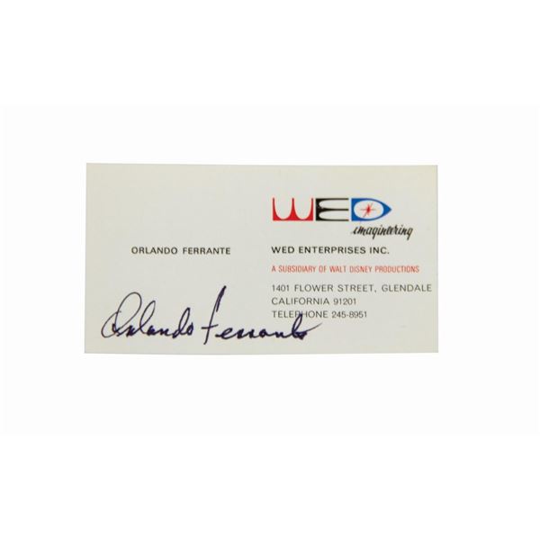 (WDI, c.1970s) An original Orlando Ferrante signed WED Imagineering business card. A former USC football teammate of Disney company president Ron Miller, Ferrante spent 40 years as an Imagineer and served as vice president of engineering, design, and production, playing a key role in the design and development of Walt Disney World, Disneyland Paris, and more. The business card features the classic WED Imagineering logo and dates from the era before Los Angeles was split into differing area codes. Ferrante has signed in black ink at bottom left, "Orlando Ferrante." Measuring 2"x3.5", the piece is in very good condition with minimal wear.