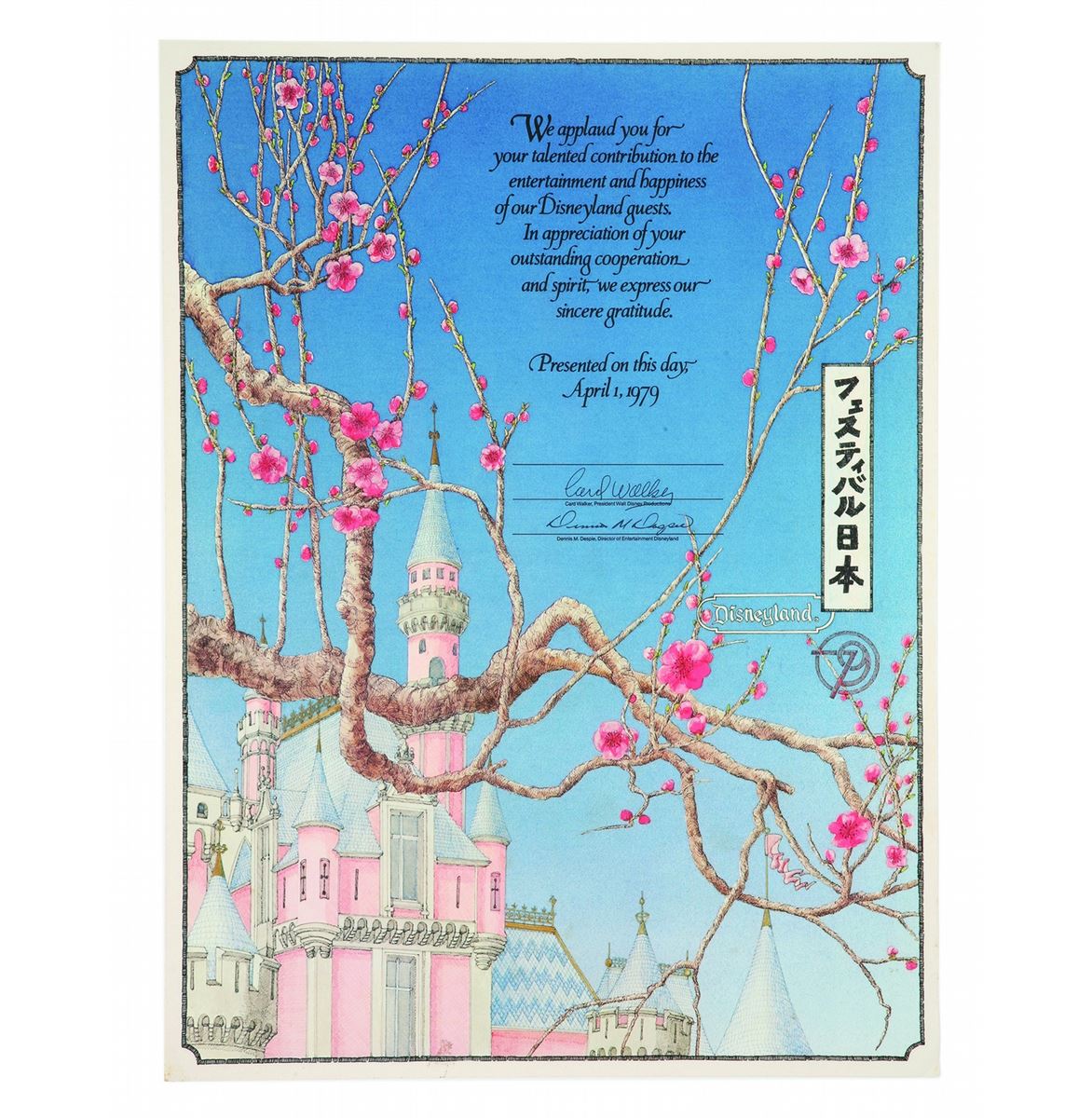 (Walt Disney Production, 1979) This oversized certificate features beautiful imagery of Sleeping Beauty's Castle among branches of a cherry blossom tree, giving a distinct Japanese feeling to the iconic Disney park imagery. This certificate was presented on April 1, 1979, by Card Walker, President of Walt Disney Productions, and Dennis Despite, Director of Entertainment - Disneyland. This certificate was likely given to high-level executives who aided in the process that led to the signing of construction plans for Disneyland in Tokyo that occurred in that very same month. This is an elegant and very rare item, measuring 20"x15". In very good condition with minimal edge and corner wear.