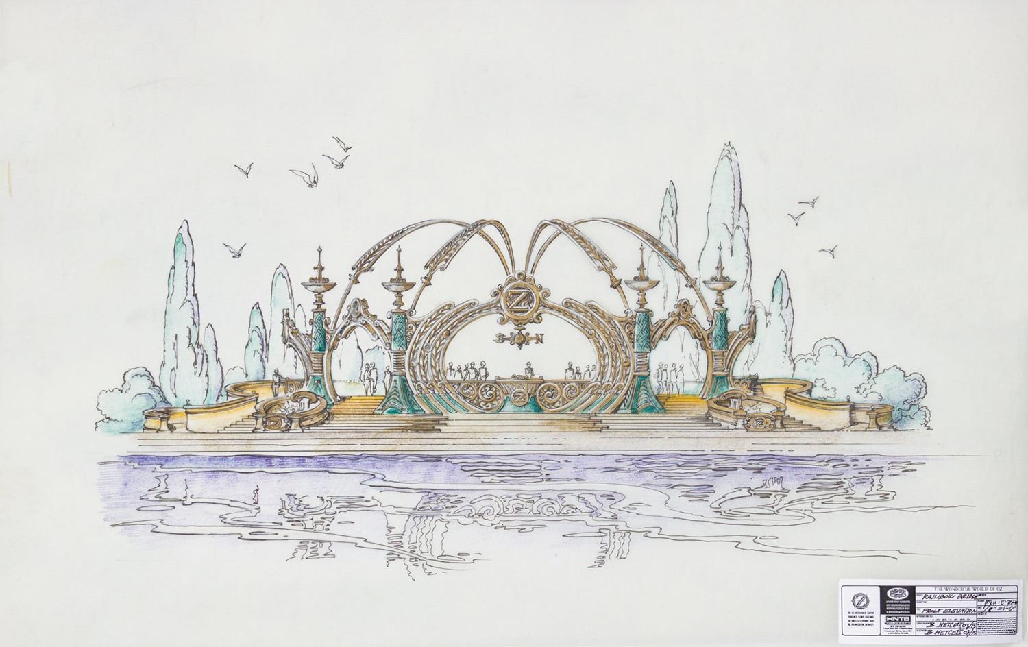 (Landmark Entertainment, c.1990s) An original concept drawing by B. Hetcel for the front elevation of the Rainbow Bridge in the proposed Oz theme park in Kansas. The rainbow bridge was meant to serve as the bridge between the lands of Kansas and Muchkinland, guiding visitors into Oz. Accomplished in ink and colored pencil, the drawing measures 14.25"x22.25" and is in very good condition with some edge-wear, including spots of creasing.