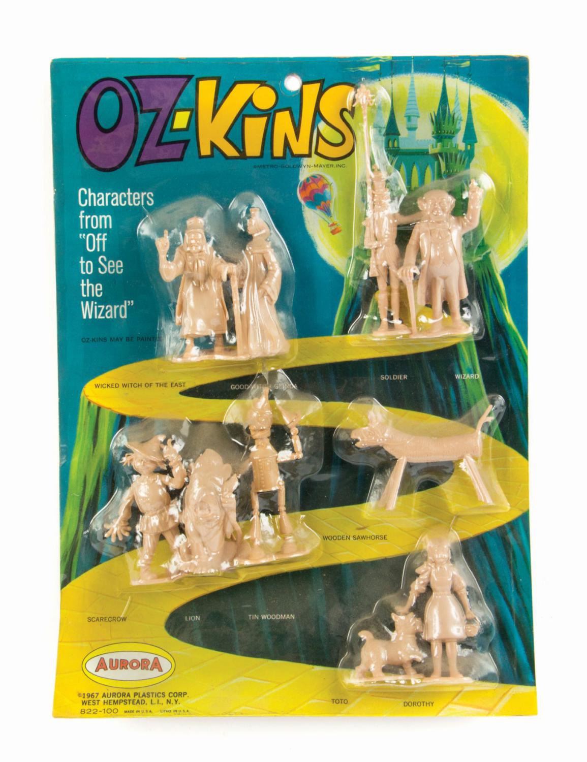 (Aurora, 1967) An unopened Oz-Kins character figure set created by Aurora Plastics Corp. The set includes (10) figures based on the characters from The Wizard of Oz. These figures were created to be painted once opened, but this rare sealed package is still adhered to its original lithographed board backing. Measuring 12"x8.5", the set is in very good condition overall with some wear to the packaging including some curving and creases to the board backing, as well as some edge-wear.