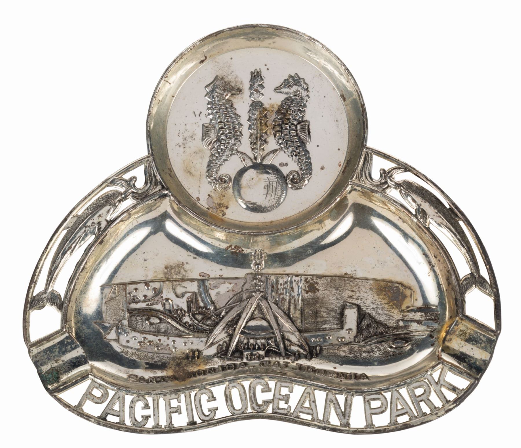 (Pacific Ocean Park, 1950s-60s) A rare souvenir silver-tone ashtray from Pacific Ocean Park in Santa Monica, California. This short-lived marine-themed amusement pier operated only from 1958 to 1967. This ashtray was made in Japan, and bears images of the Park's three seahorse logo and front of park view. Measuring approximately 5.5"x5", the ashtray is in good condition with some areas of spotting and finish wear from use.