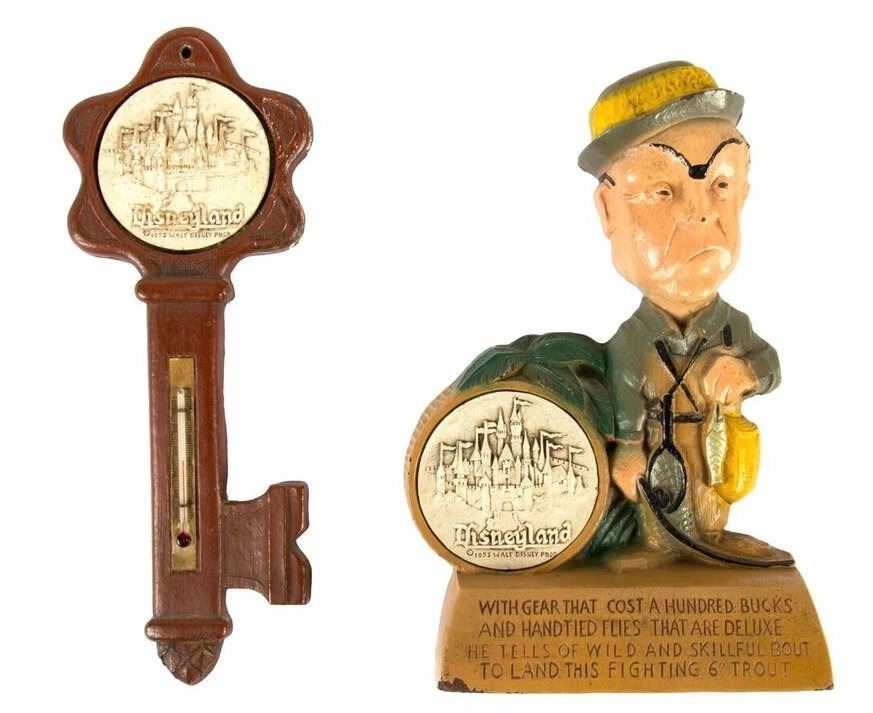 (Disneyland, 1955) A charming pair of souvenirs from Disneyland's opening year. Both of these items feature a white embossed logo of Sleeping Beauty Castle with a 1955 Walt Disney Productions copyright mark. This pair includes a working wall thermometer shaped like a key, and a humorous fisherman statue. The thermometer measures 8.25" tall while the fisherman statue measures 8" tall. Both items are in good condition with expected wear from age.