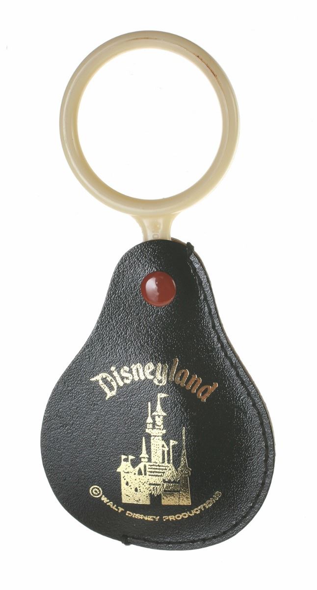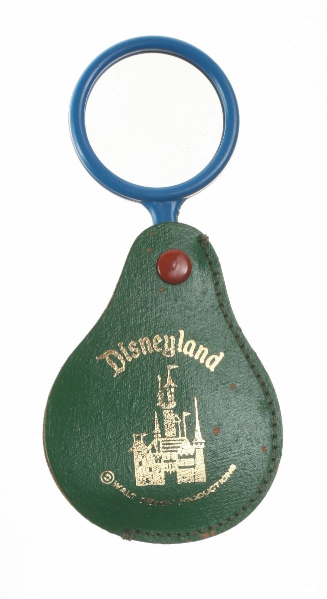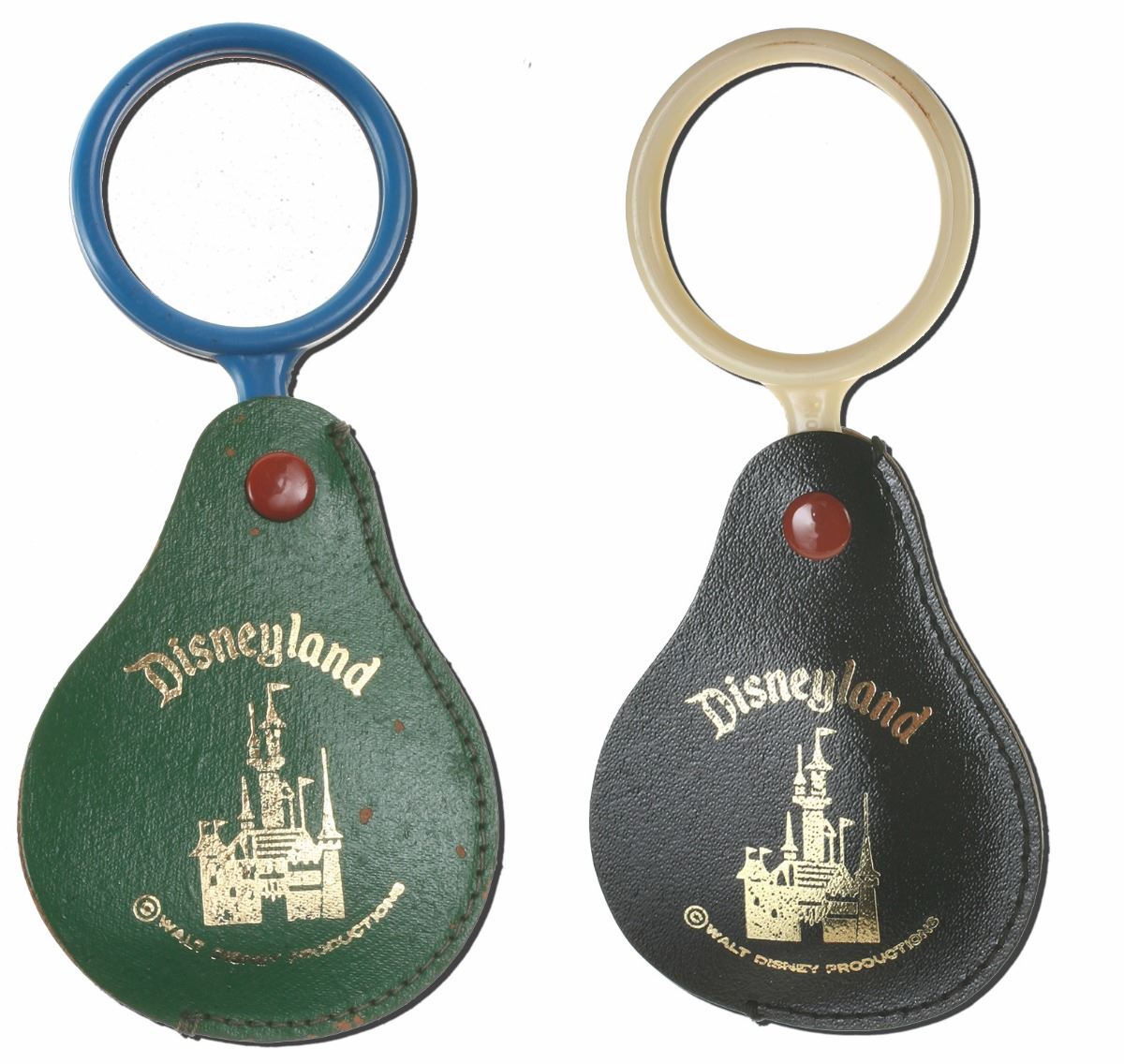 (Disneyland, 1960s) A very rare pair of product samples from the collection of Jack Olsen. These magnifying glasses both have their own leather pouch featuring sleek gold-colored Disneyland imagery and text on the surface. Each measures 3.5"x2.5". In good condition with minimal wear. In the mid-1950s, when Disneyland was nearing completion, a problem arose with park merchandise. Disney had an existing Merchandising Division in New York that operated under principles established by Disney’s Merchandising Executive Kay Kamen in the 1930s. However, Disney’s method had generally been to grant companies the rights to use Disney characters on their existing merchandise. For the new park, the need arose for products which had no existing licensee.