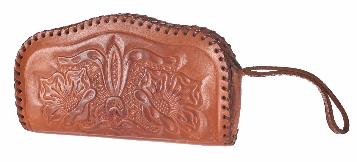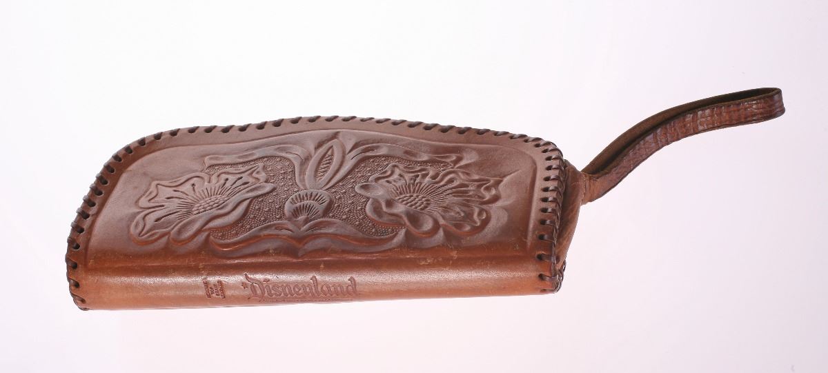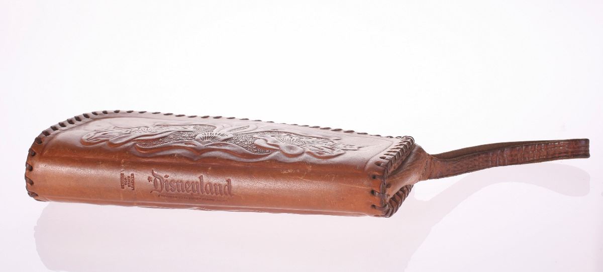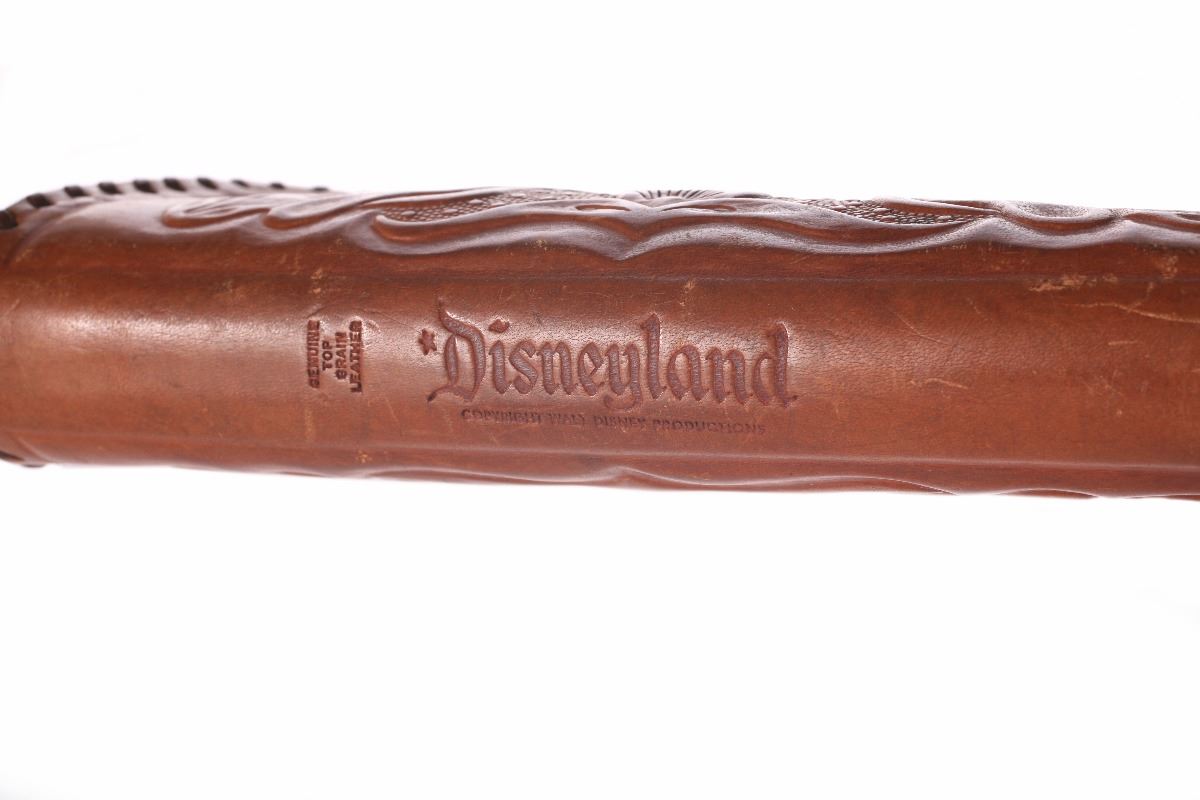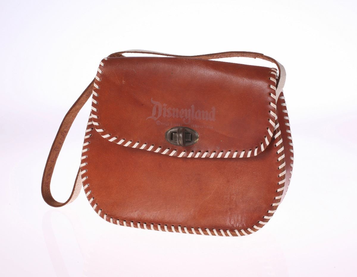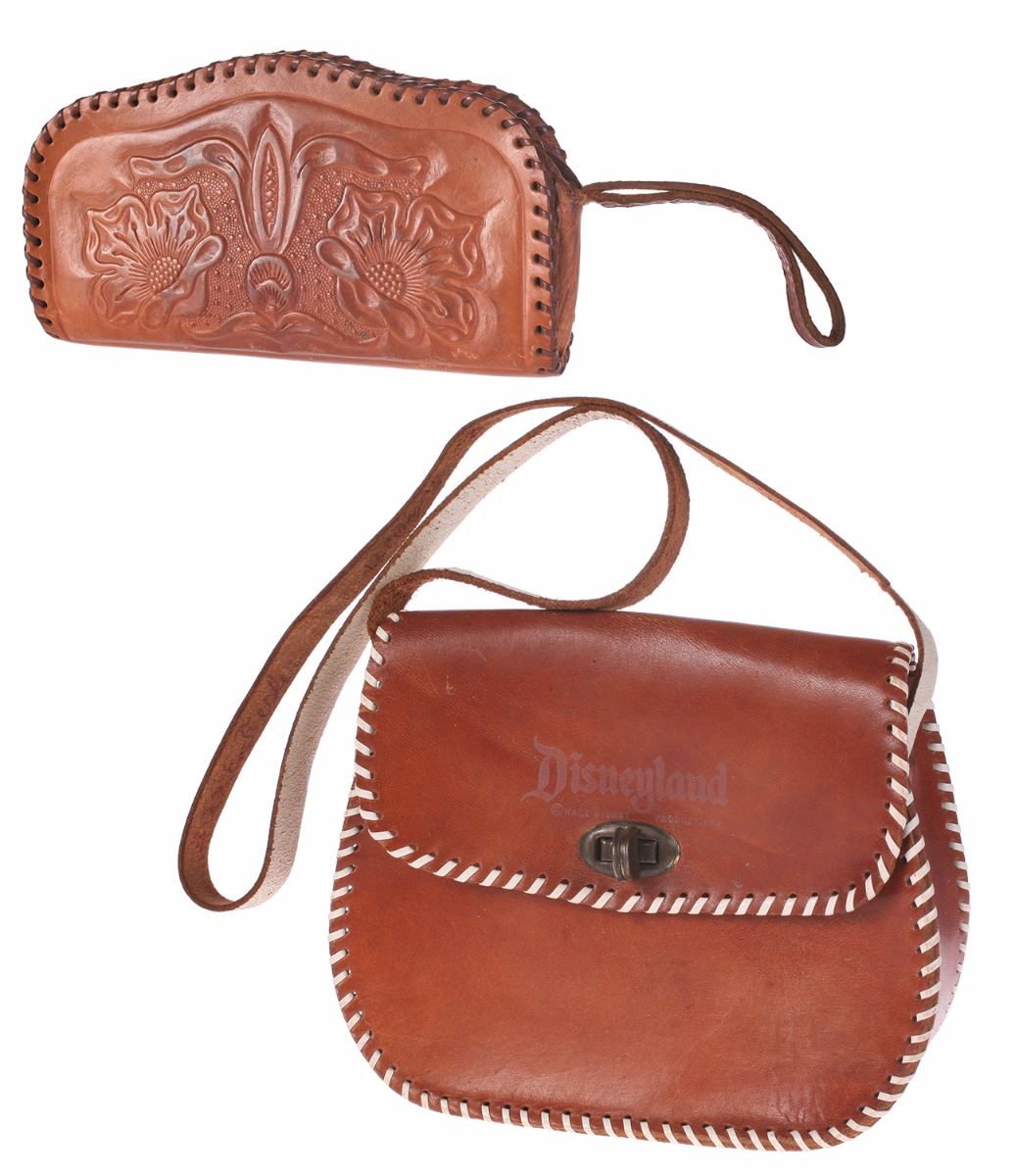 (Disneyland, 1950s) Pair of Frontierland purses including (1) brown leather clasping purse with "Disneyland" written on the front and (1) large leather Disneyland purse with separated zipper, causing it to remain open. Pair is in good condition with some wear.