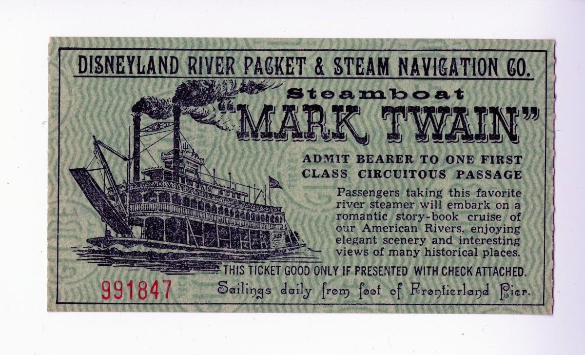 (Disneyland, 1957) Pair of (2) "Mark Twain" riverboat tickets from the early days of the park. Both tickets measure 2.5"x4.75" and have been used, so they are missing their ticket stub. Both are in very good condition overall.