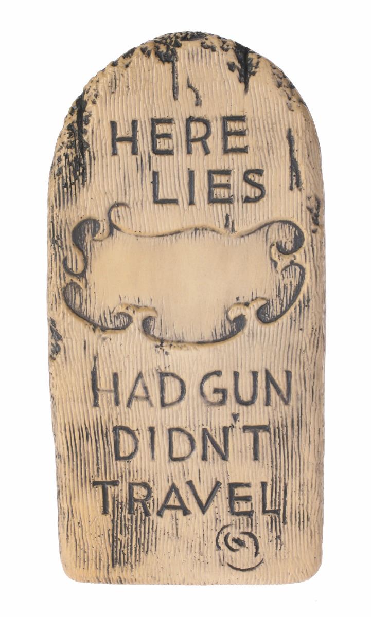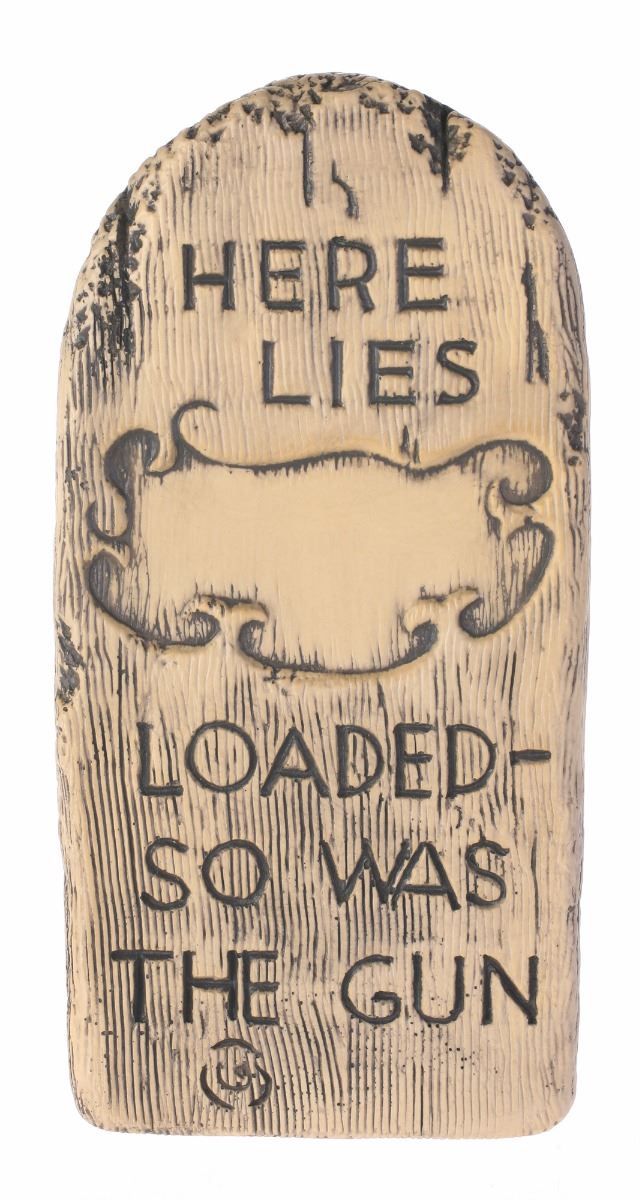 (Disneyland, 1969) Randotti souvenir collection including (2) Randotti Western-Style "Boothill" tombstones with blank spaces for name personalization. Reads, “Loaded - So Was the Gun“ and "Had Gun Didn't Travel". Ready to hang on the wall. Measures 7.4"x3.75" and 0.8" thick, each. In very fine condition.