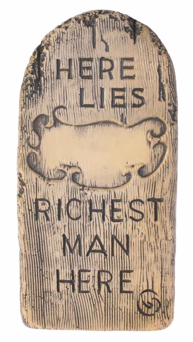 (Disneyland, 1969) Randotti souvenir collection including (2) Randotti Western-Style "Boothill" tombstones with blank spaces for name personalization. Reads, “Richest Man Here“ and "Bang Bang Like Wow". Ready to hang on the wall. Measures 7.4"x3.75" and 0.8" thick, each. In very fine condition.