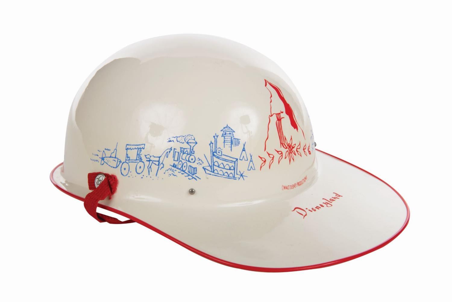 (Disneyland, c.1960s) A pair of (2) white Keppy Kaps from Disneyland. Known variously as "Keppy Kaps" and "Disneyland Sports Caps," these particular rare models feature the Matterhorn prominently over the imagery and related indicia of Disneyland's cardinal lands. Measuring 11"x7.5" and 4.5" tall, these caps of protective "shock proof Butyrate," are in good condition with minor wear from use, with (1) cap exhibiting a 2" abrasion.