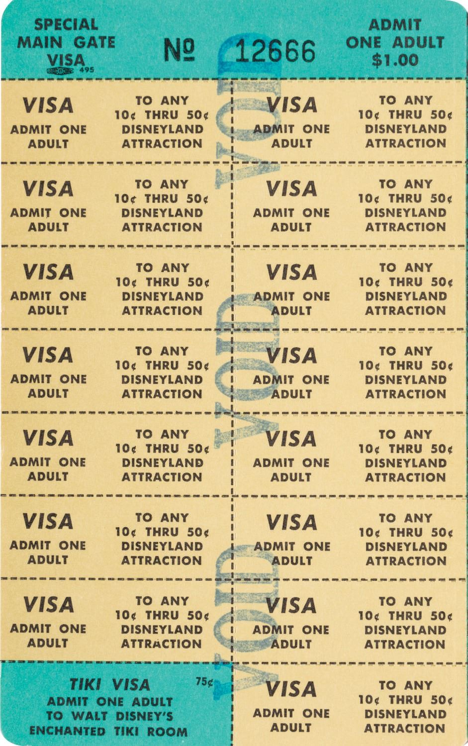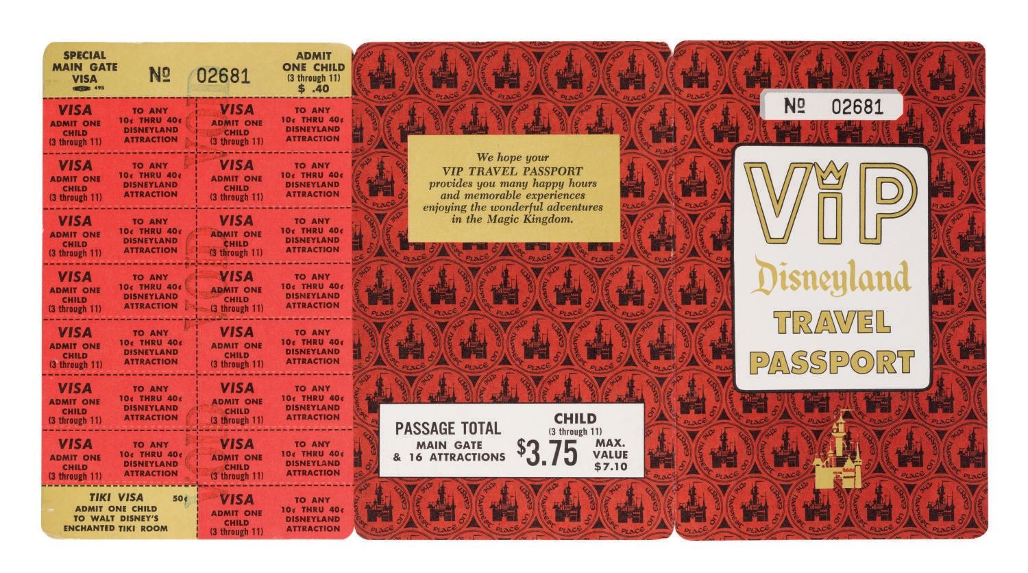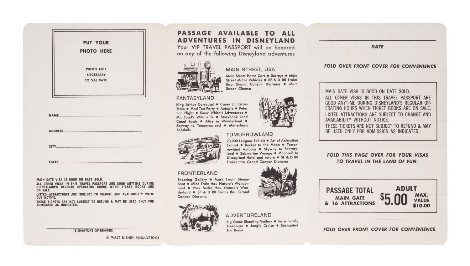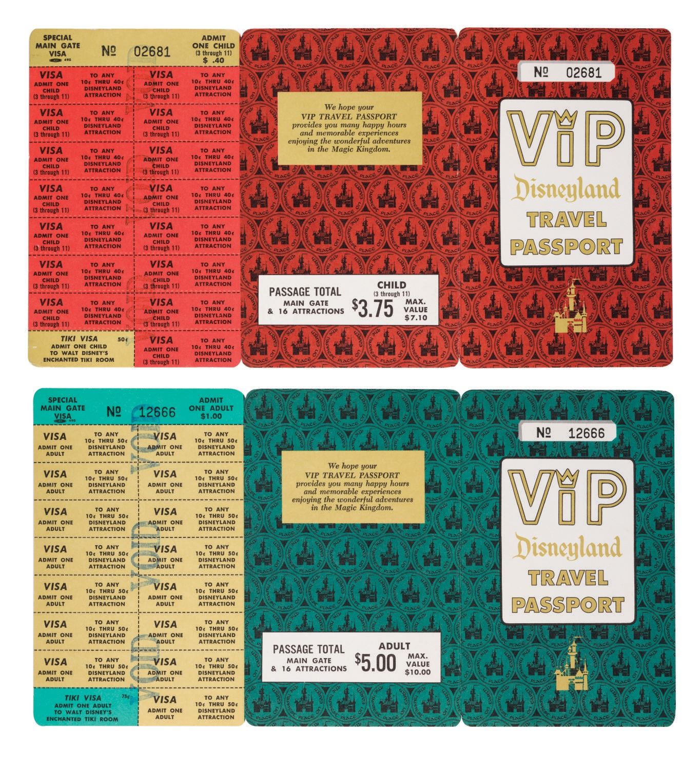 (Disneyland, c.1963-64) A pair of VIP Disneyland Travel Passport Main Gate Visas. The Adult and Child Passport included a main gate admission ticket, and enabled the holder to enjoy 16 adventures from a selection of more than 33 exhibits and attractions including Walt Disney's Enchanted Tiki Room. These unused passports include all tickets attached. They come from the collection of Disney Imagineer Milt Albright and were probably his initial samples as they are stamped "VOID" across the perforated tickets. Measuring 6"x3.75" when folded, each passport displays in fine condition.