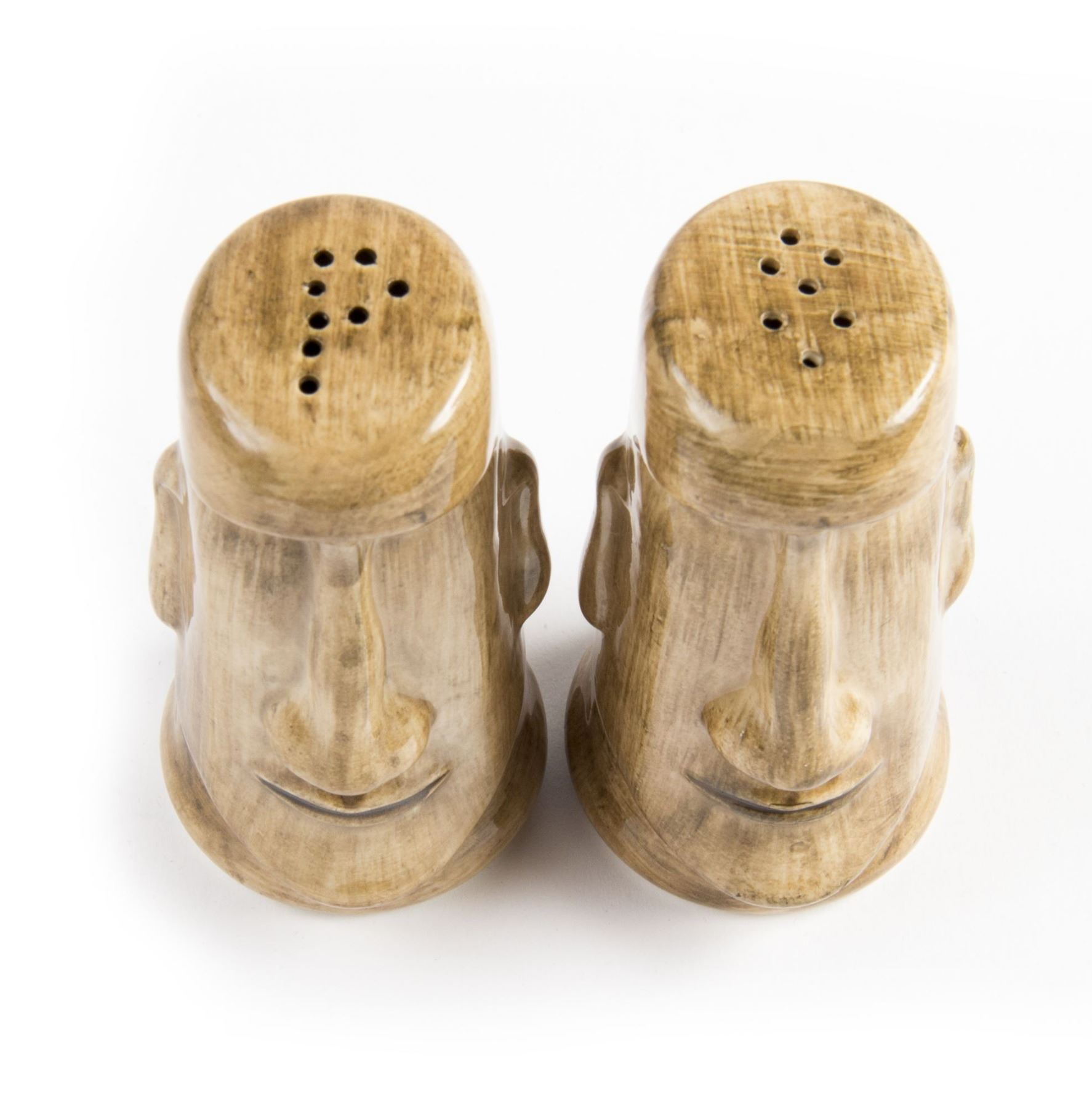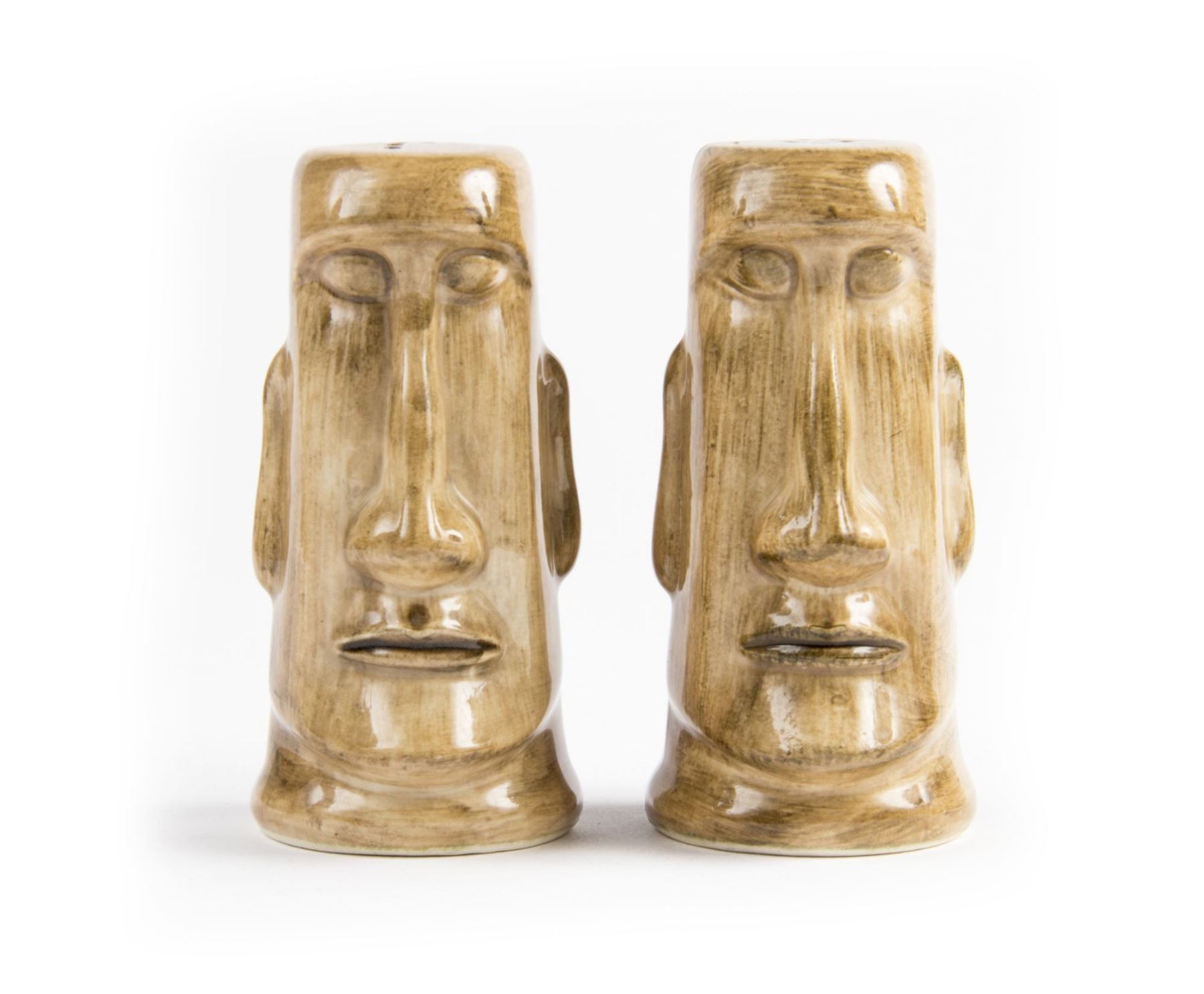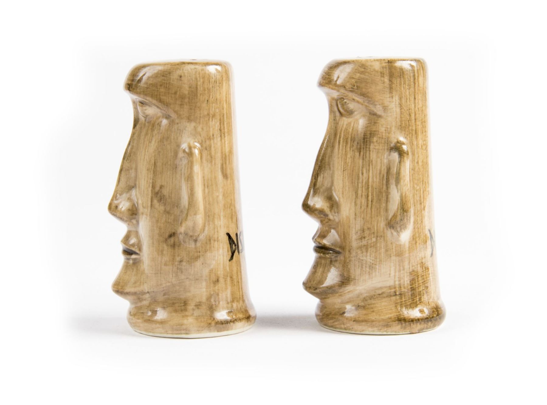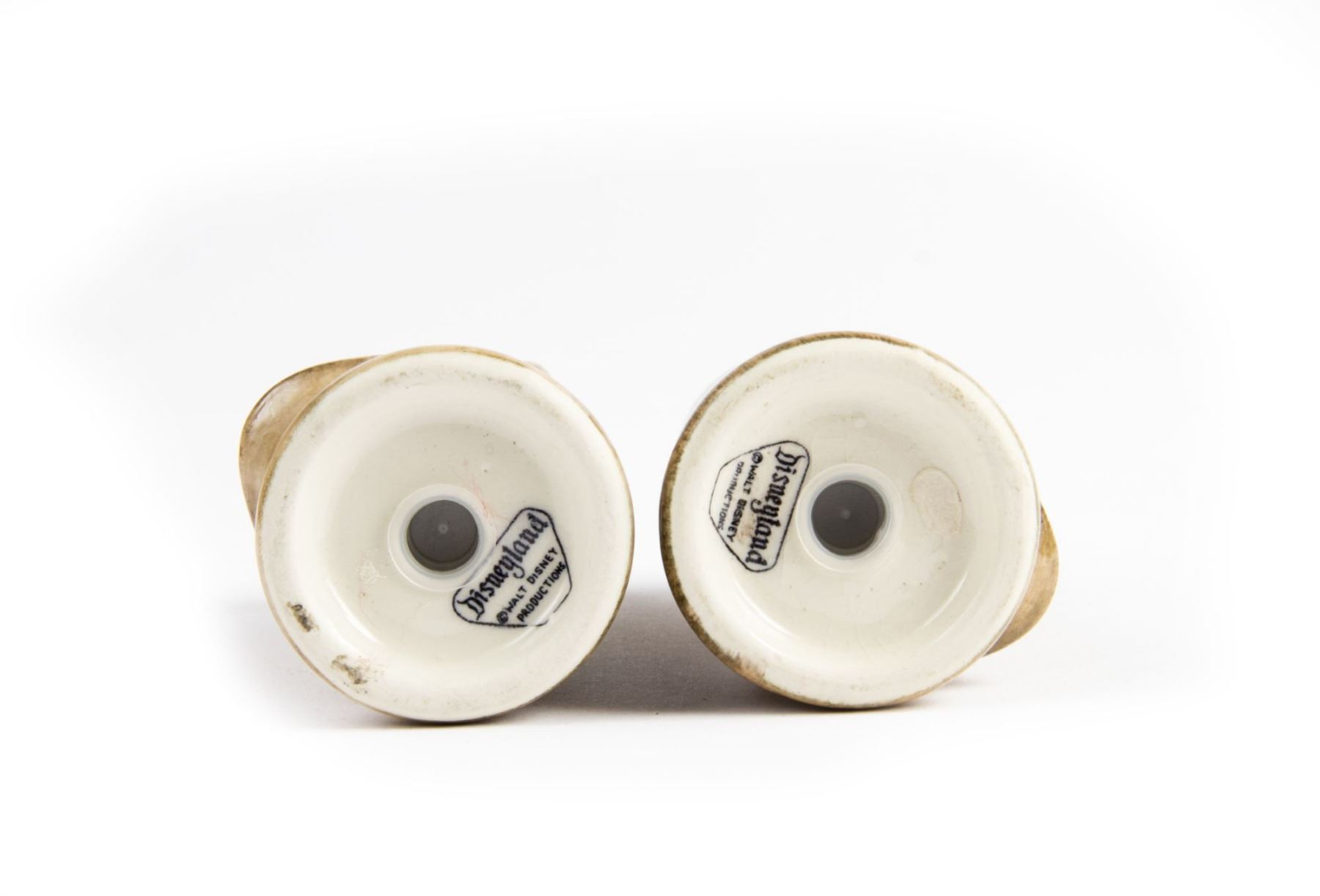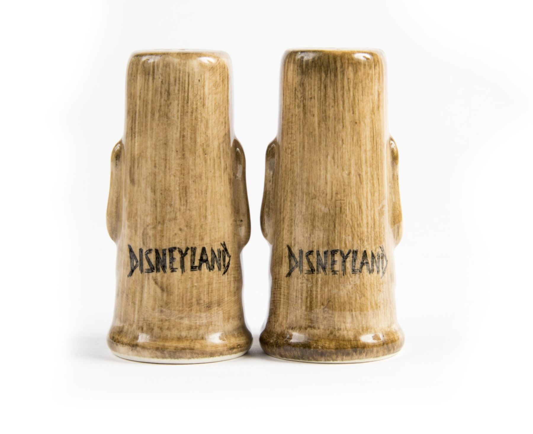 (Disneyland, c.1955-60s) A pair of early hand-painted souvenir salt and pepper shakers from Adventureland. The shakers read "Disneyland" on the back sides and have the Disneyland seal on their bases. The holes on top of each shaker spell out a "S" and "P" to distinguish the shakers. Each shaker measures approximately 2.25" in diameter and 4.25" tall. The pair is in very good condition.
