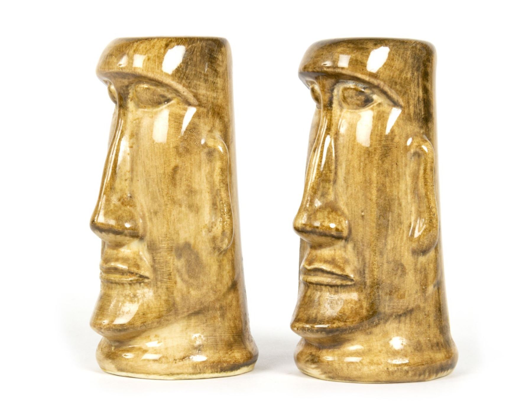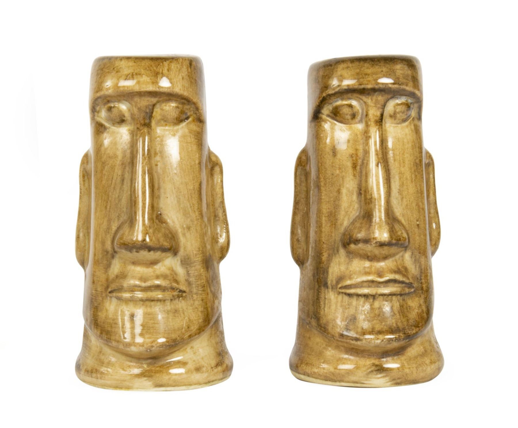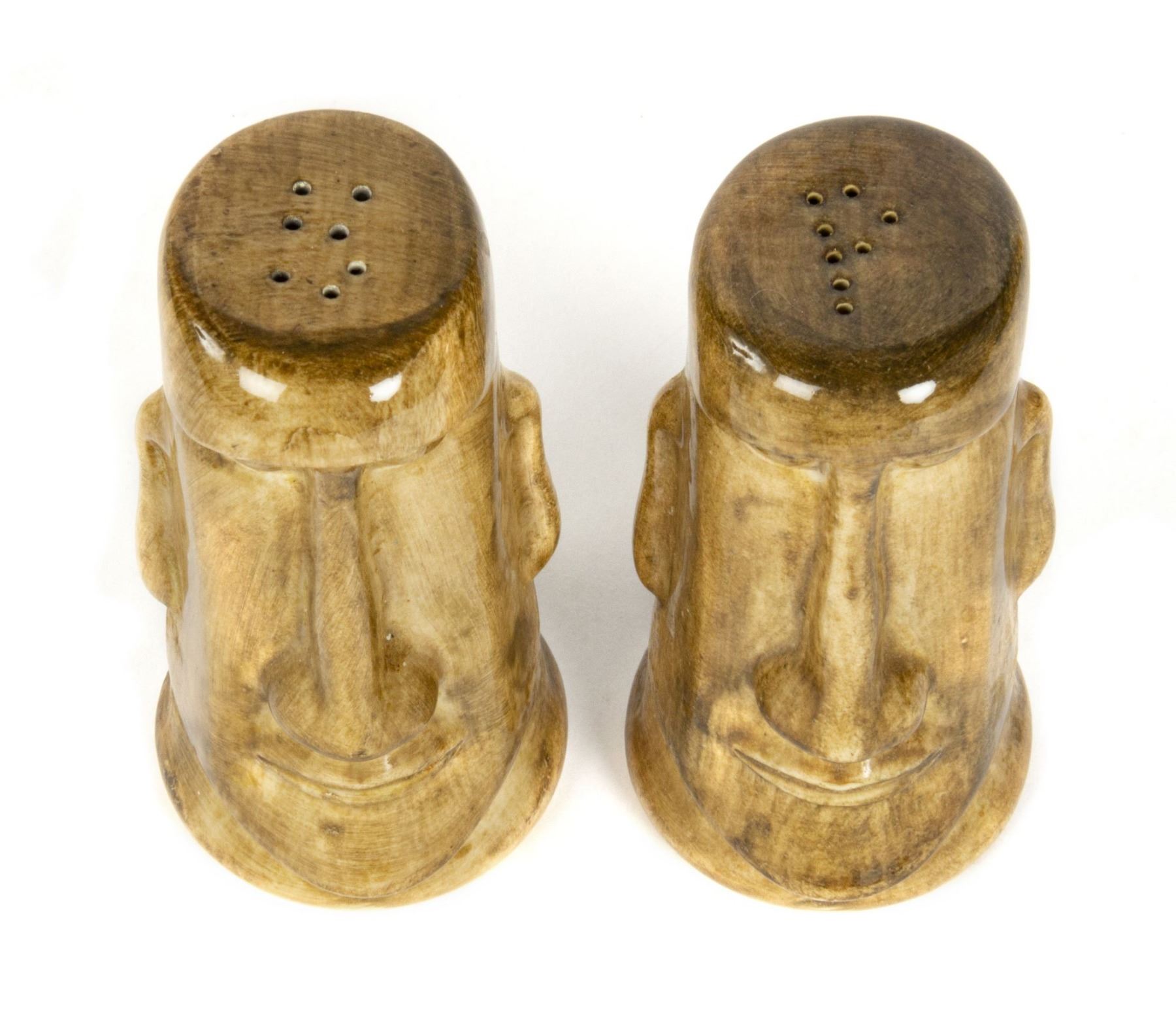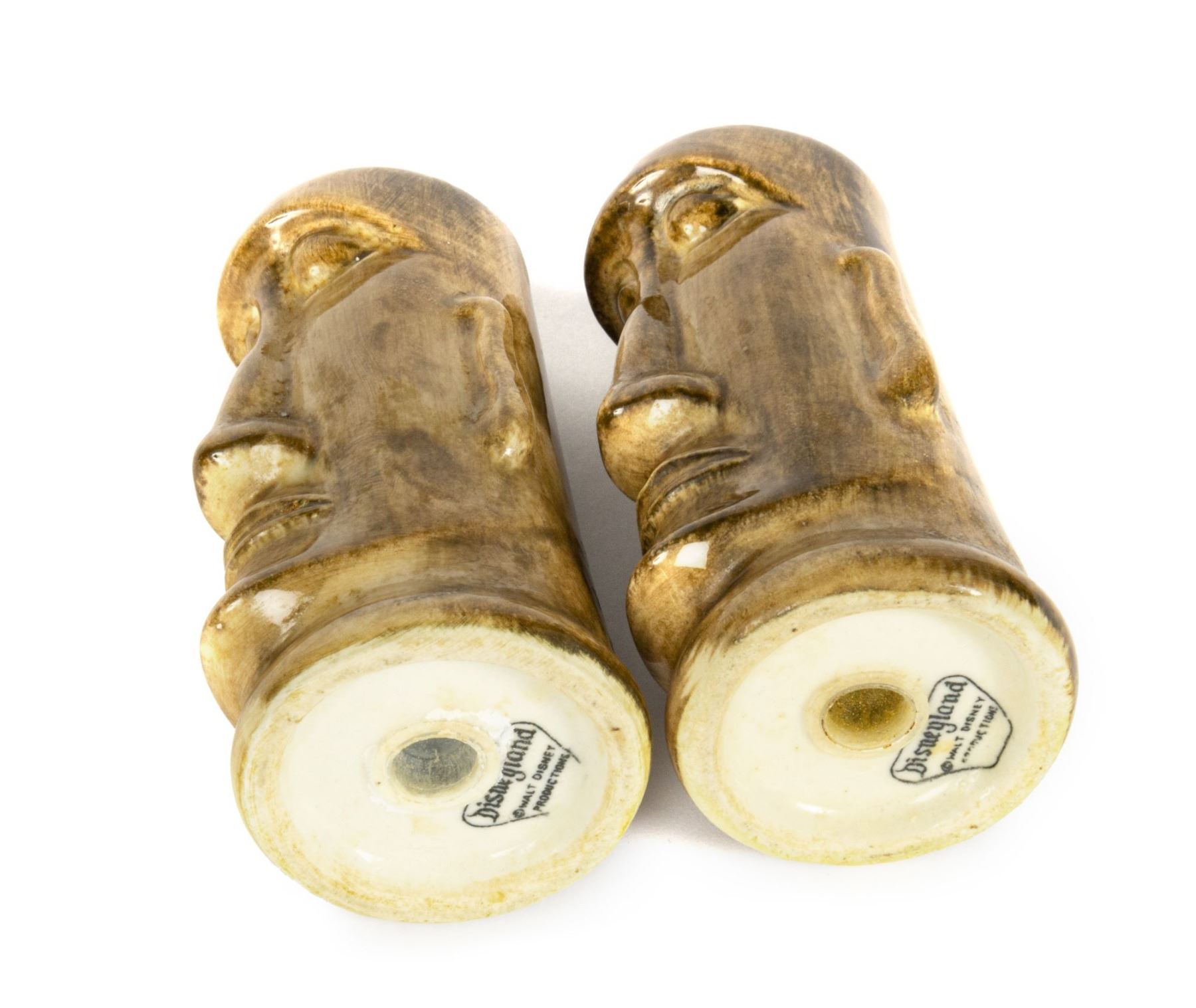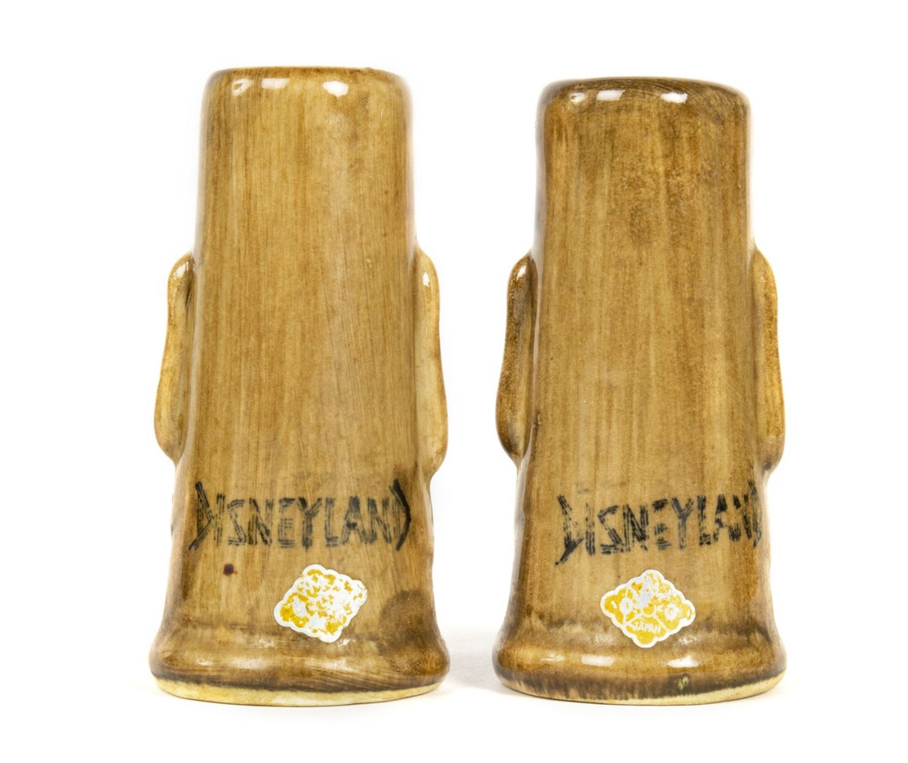 (Disneyland, c.1956) An early pair of hand-painted souvenir salt and pepper shakers from Adventureland. The shakers read "Disneyland" on the back sides and have the Disneyland seal on their bases. Each shaker measures approximately 2.25" in diameter and 4.25" tall. The pair is in good condition with some fading to the word "Disneyland" on the reverse from age and some surface wear from use.