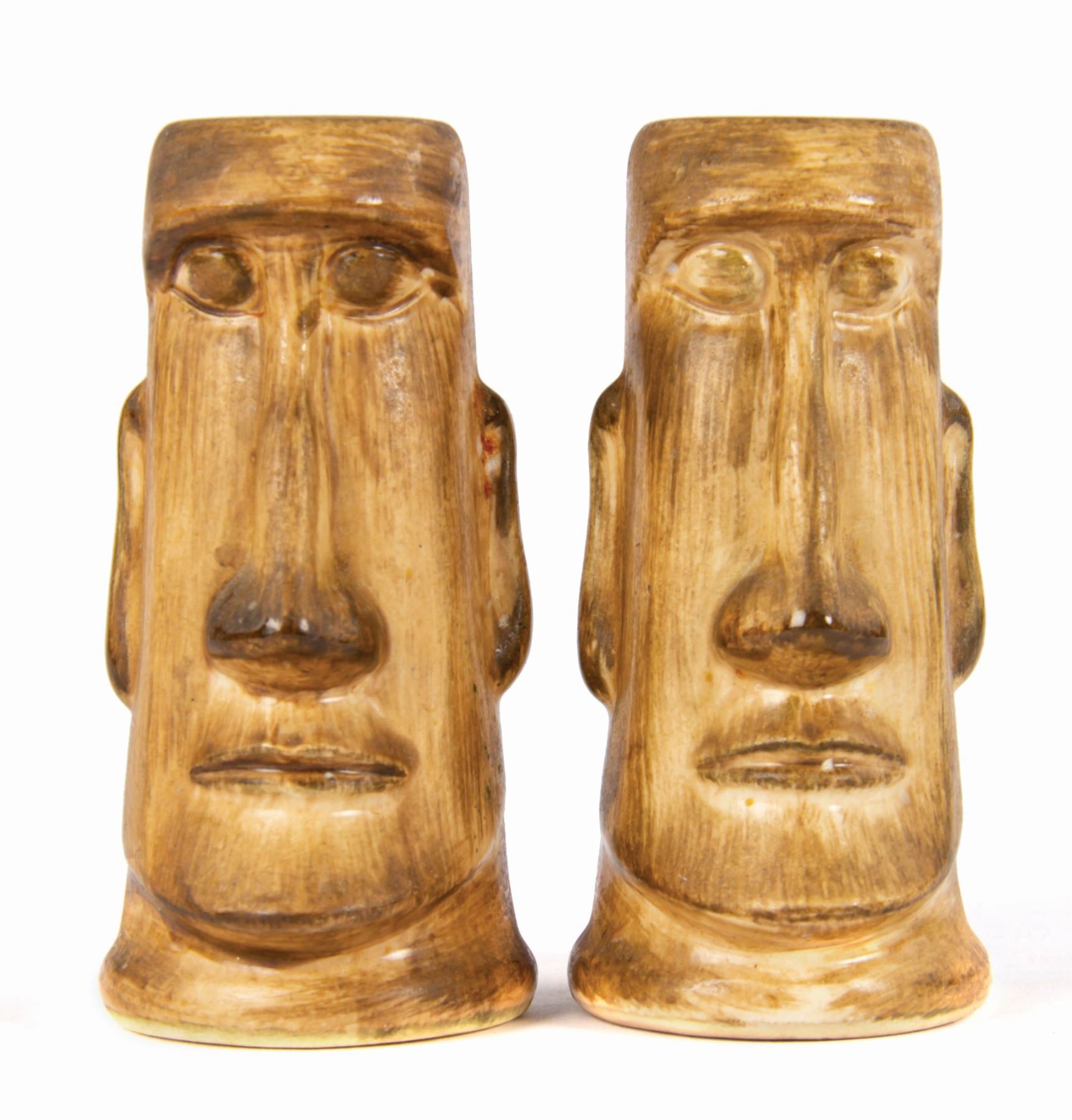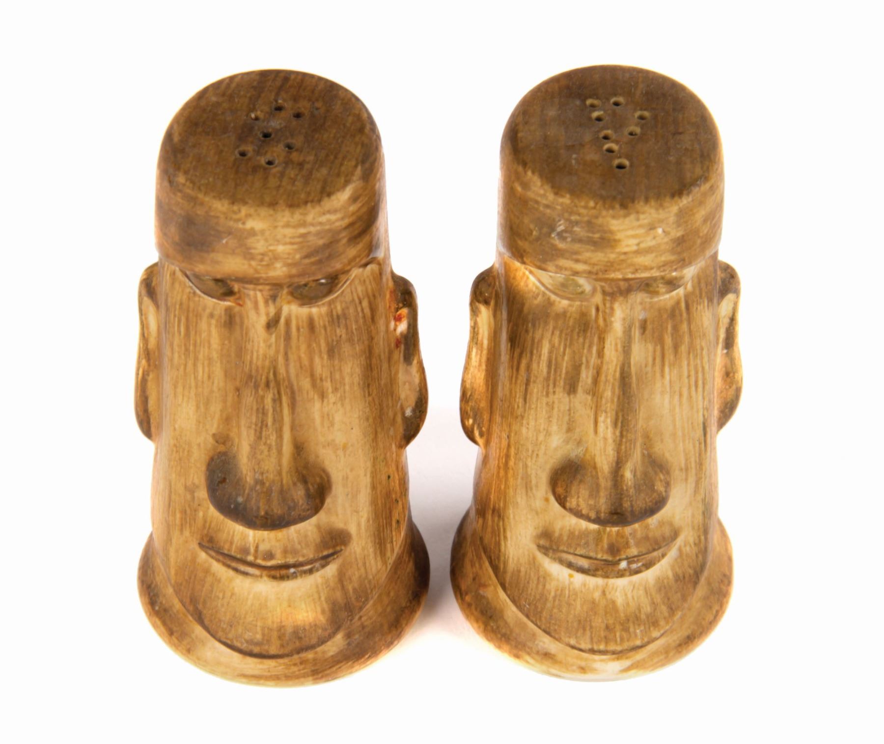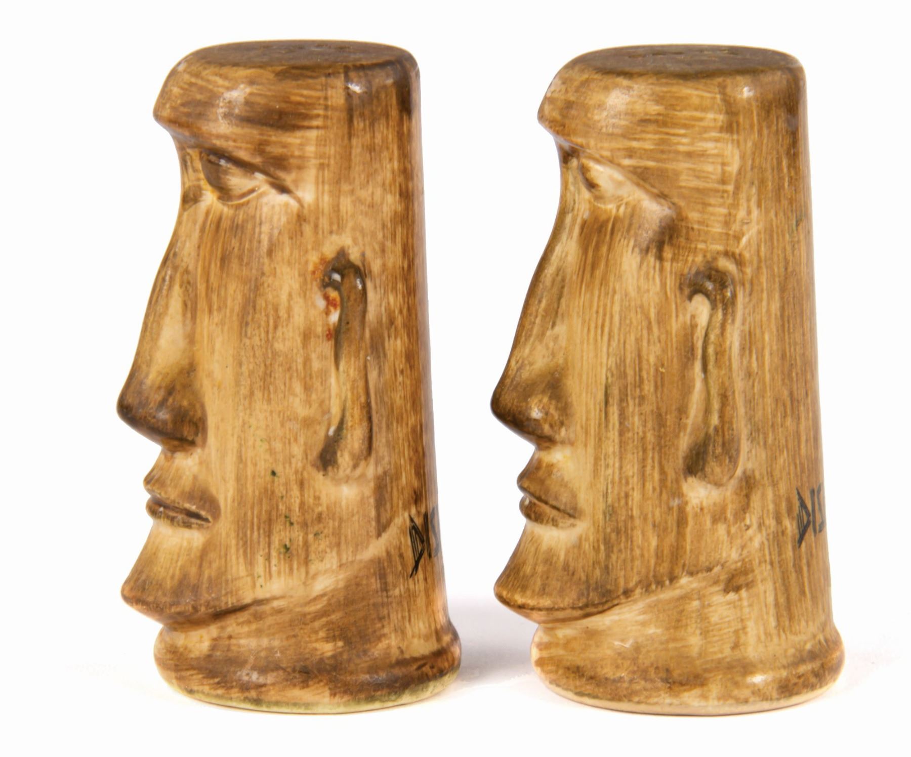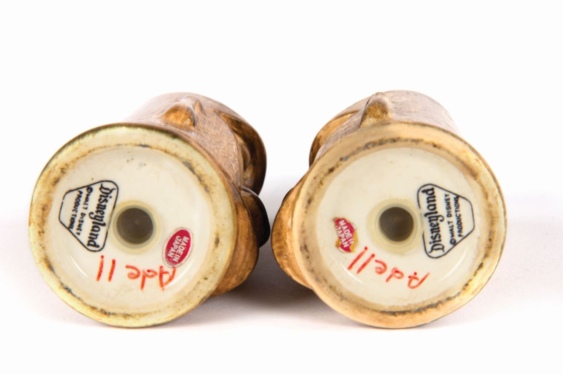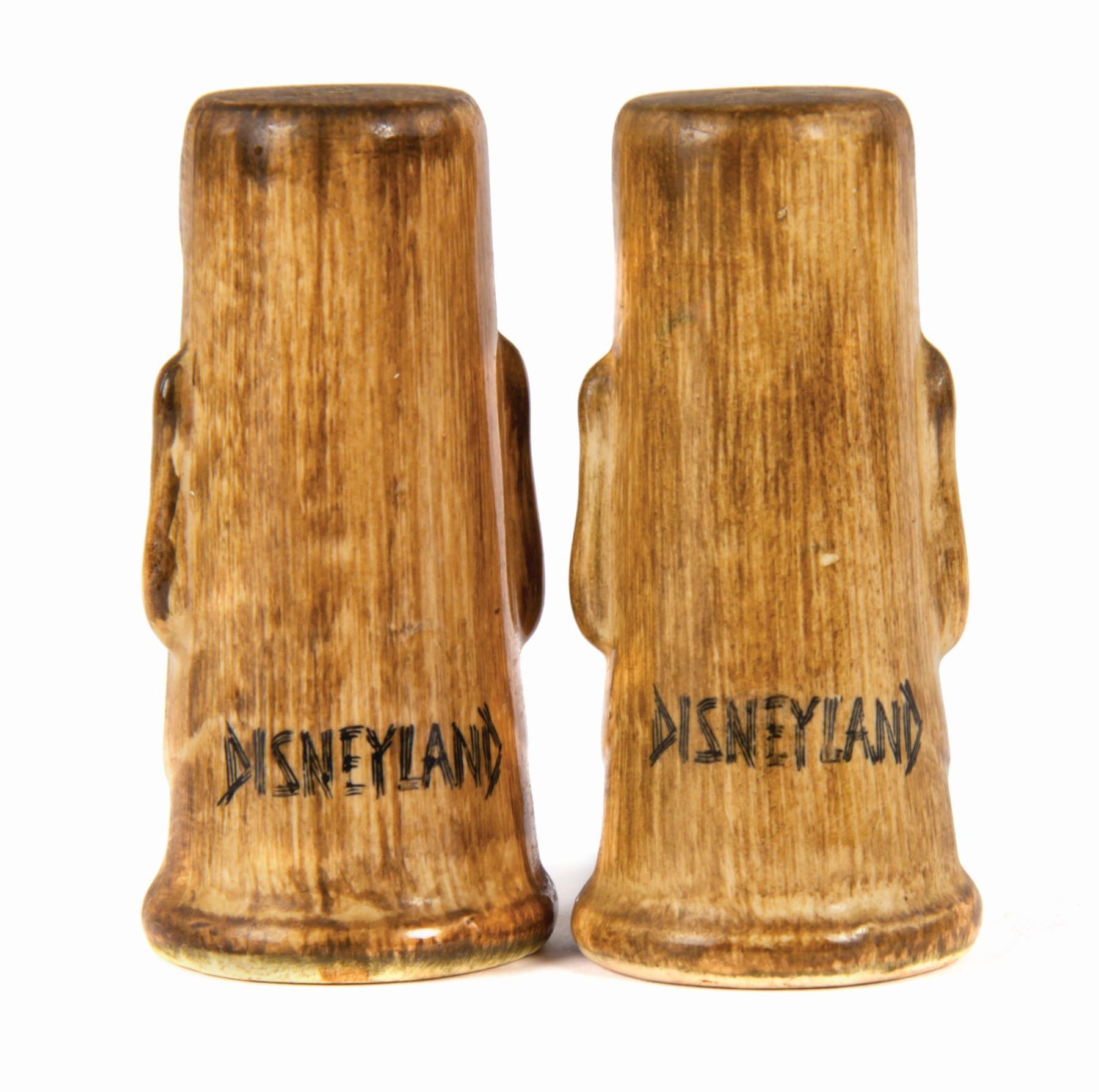 (Disneyland, c.1960) A pair of early hand-painted souvenir salt and pepper shakers from Adventureland. The shakers read "Disneyland" on the reverse and have the Disneyland seal on their bases. Each shaker measures approximately 2.25" in diameter and 4.25" tall. The pair is in very good condition with minor surface wear from light use. The original owner wrote their name on the bases.