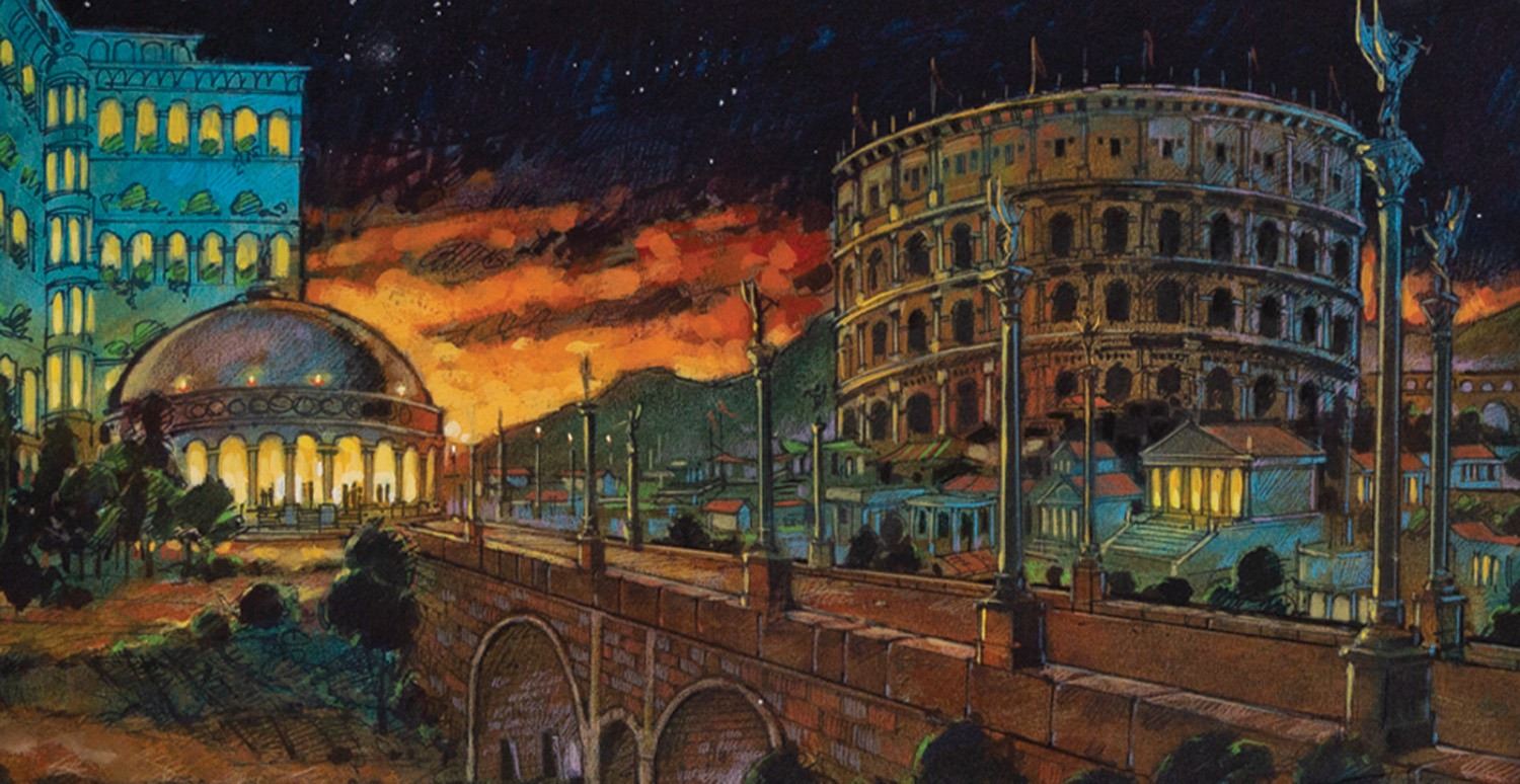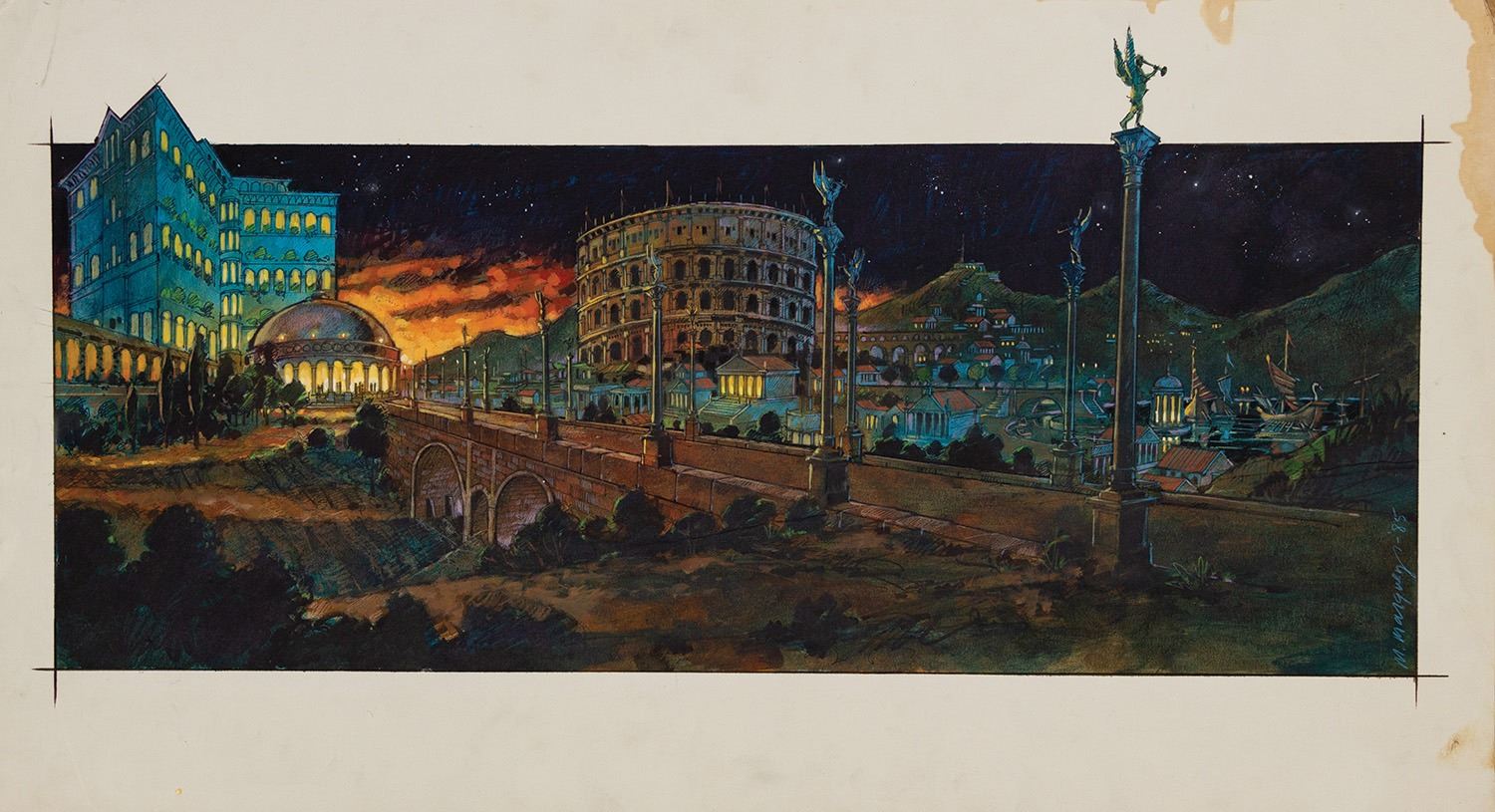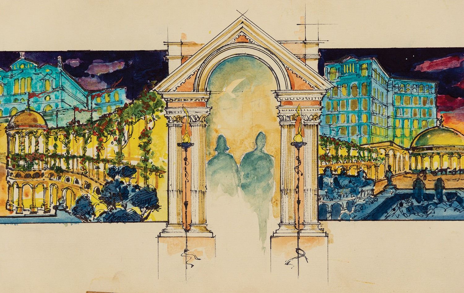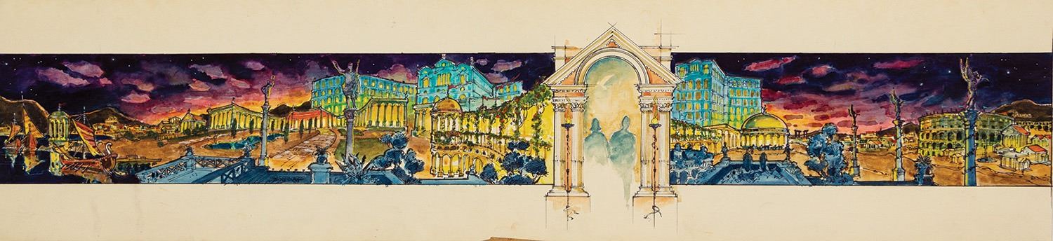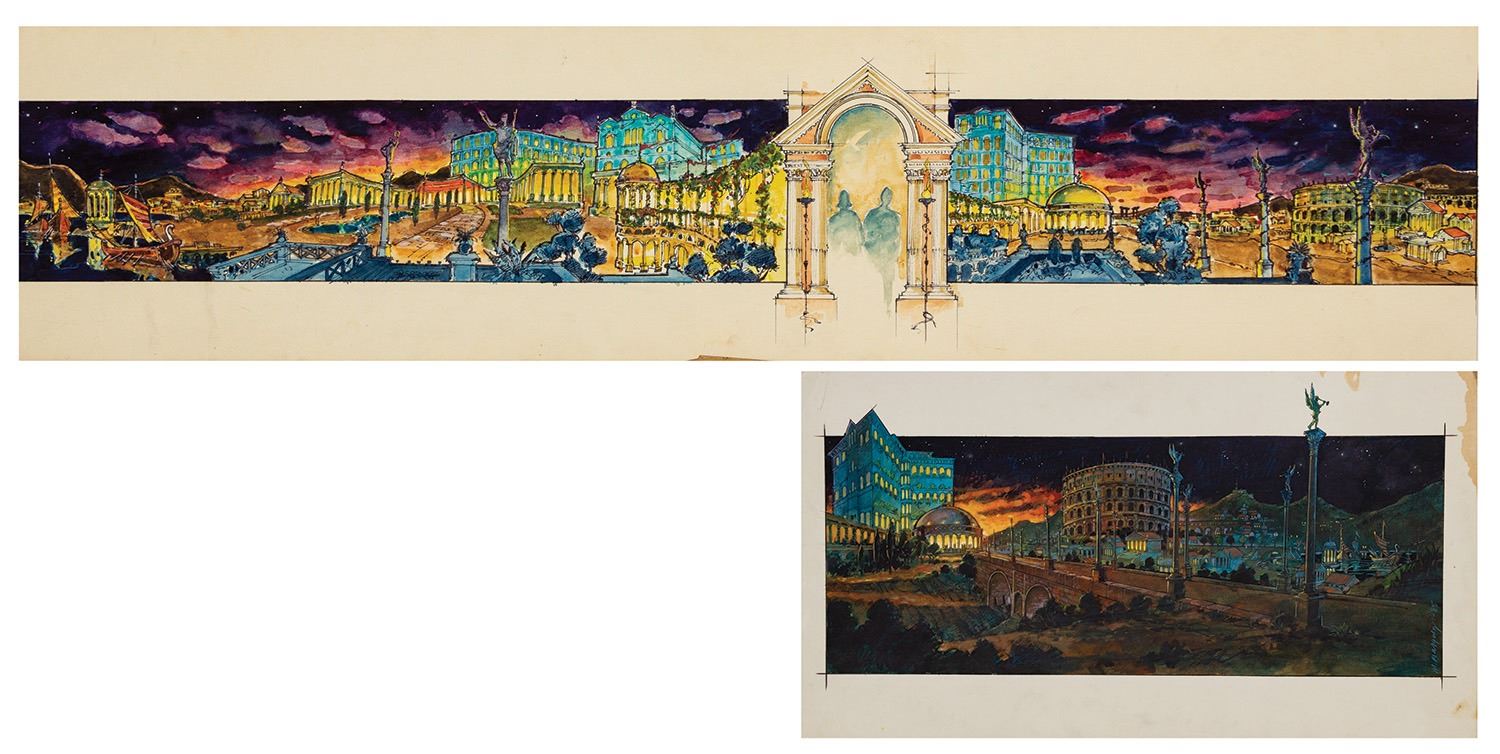 (Landmark Entertainment, c.1980s) A pair of original concepts for Caesars Palace Rotunda and Forum. These stunning concepts capture these proposed design elements for Caesars Palace against a Roman-style backdrop. Accomplished in ink, paint, and marker, the concepts measure 8.5"x36" and 16.5"x30". The condition is very good with expected edge-wear from age and use, including pin marks along the top edge of the panoramic concept and some discoloration to the left side of the other. The images are unaffected.