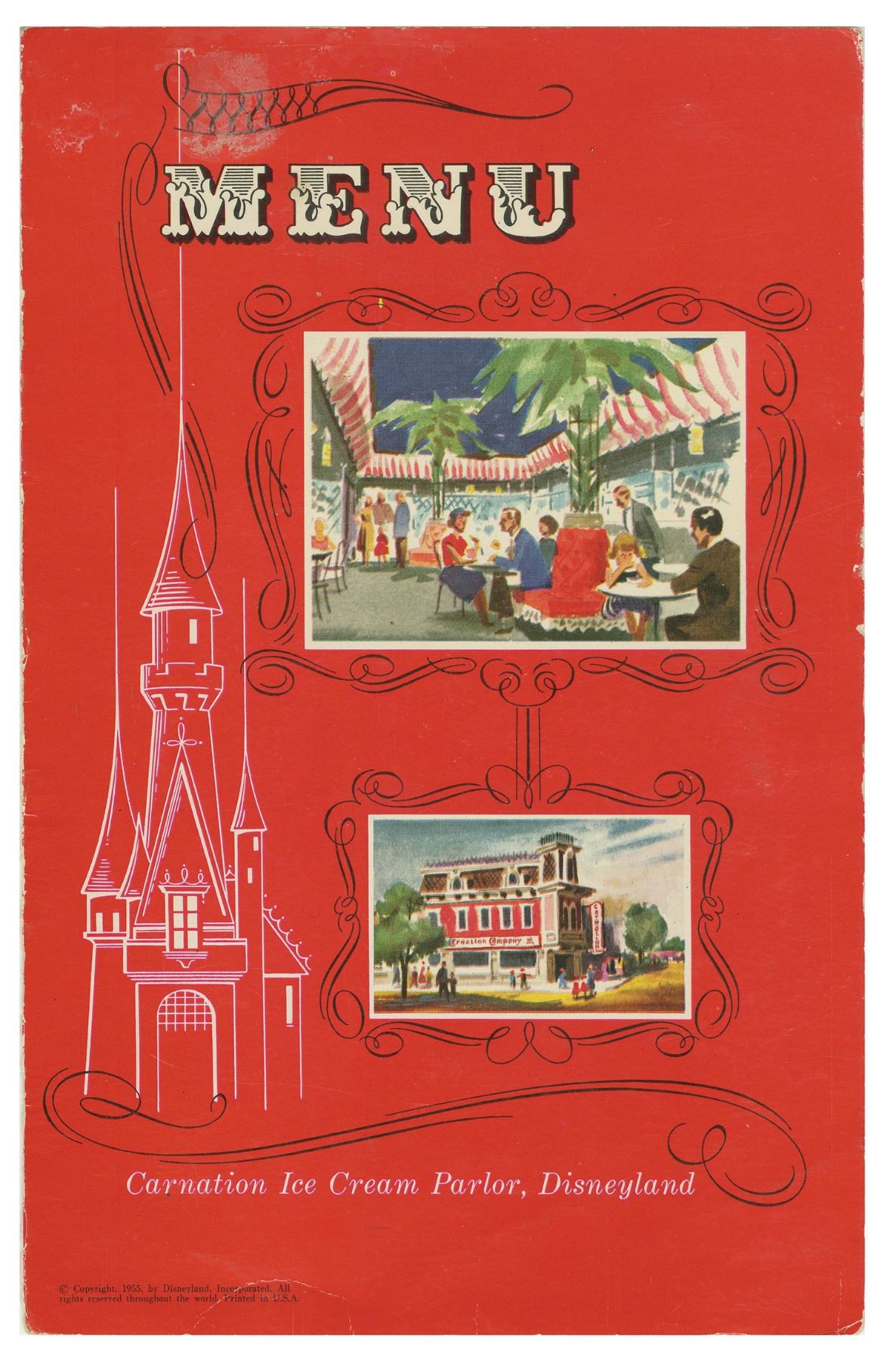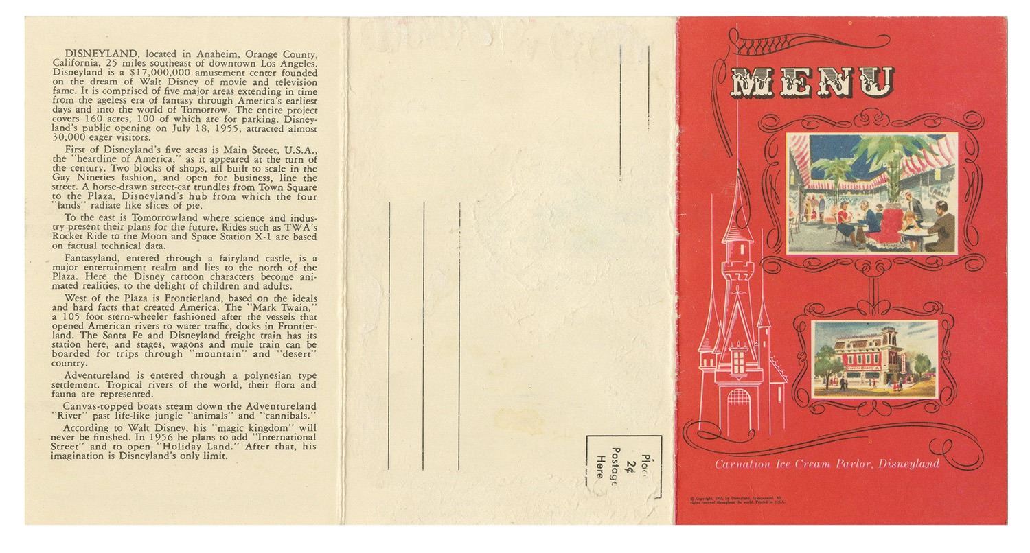 (Disneyland, 1955) A pair of menus from the Carnation Ice Cream Parlor in Disneyland. The pair includes a full-size menu from the restaurant and a smaller souvenir menu that could be mailed as a postcard. Both list the popular Disneyland-themed menu items inside. Measuring 9.75"x6.75" and 4.5"x3" respectively, the restaurant and souvenir menus are in fair condition with wear to the edges and folds. The full-size menu has a split on the lower 1.5" of the spine, and both menus have some surface residue.