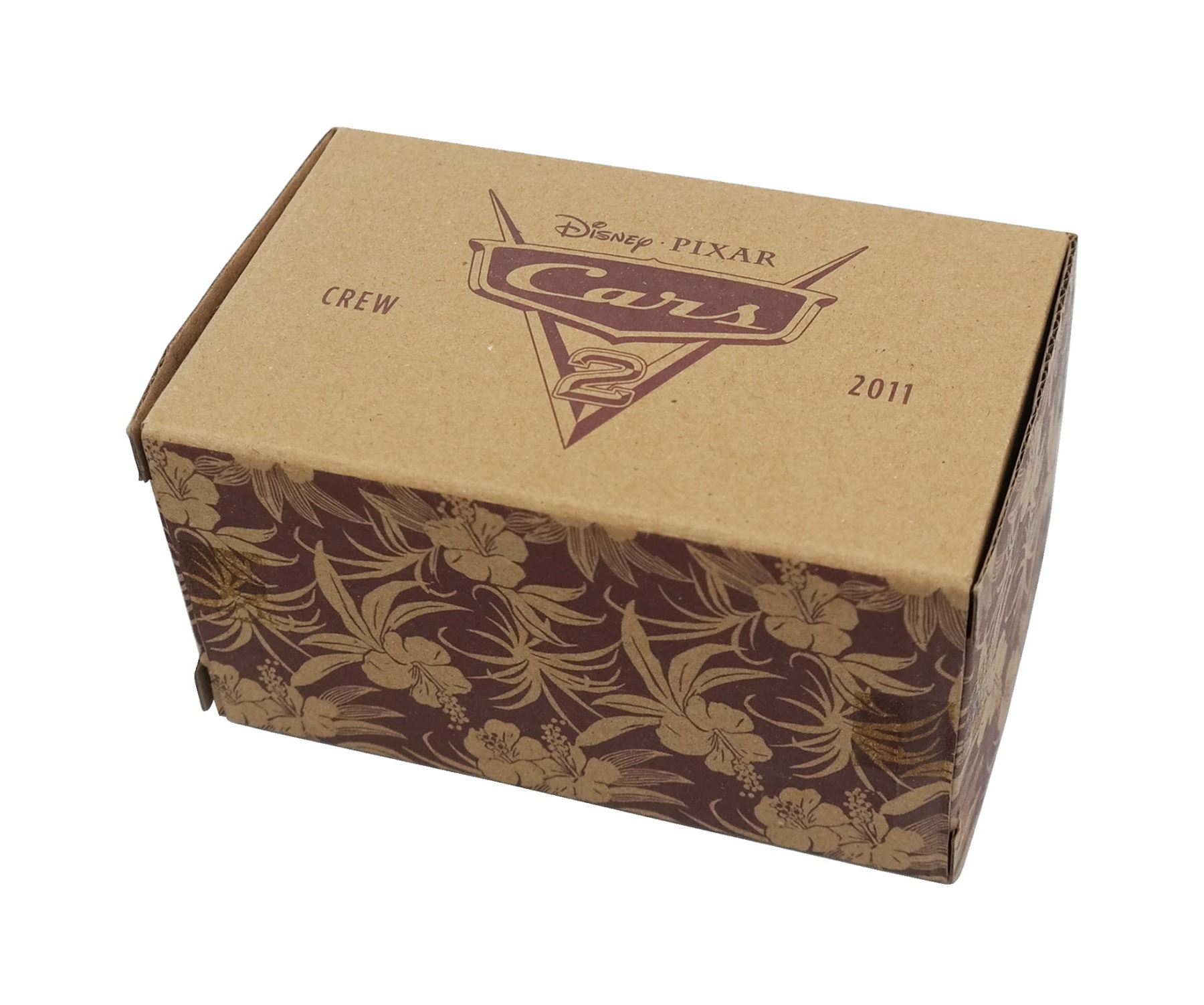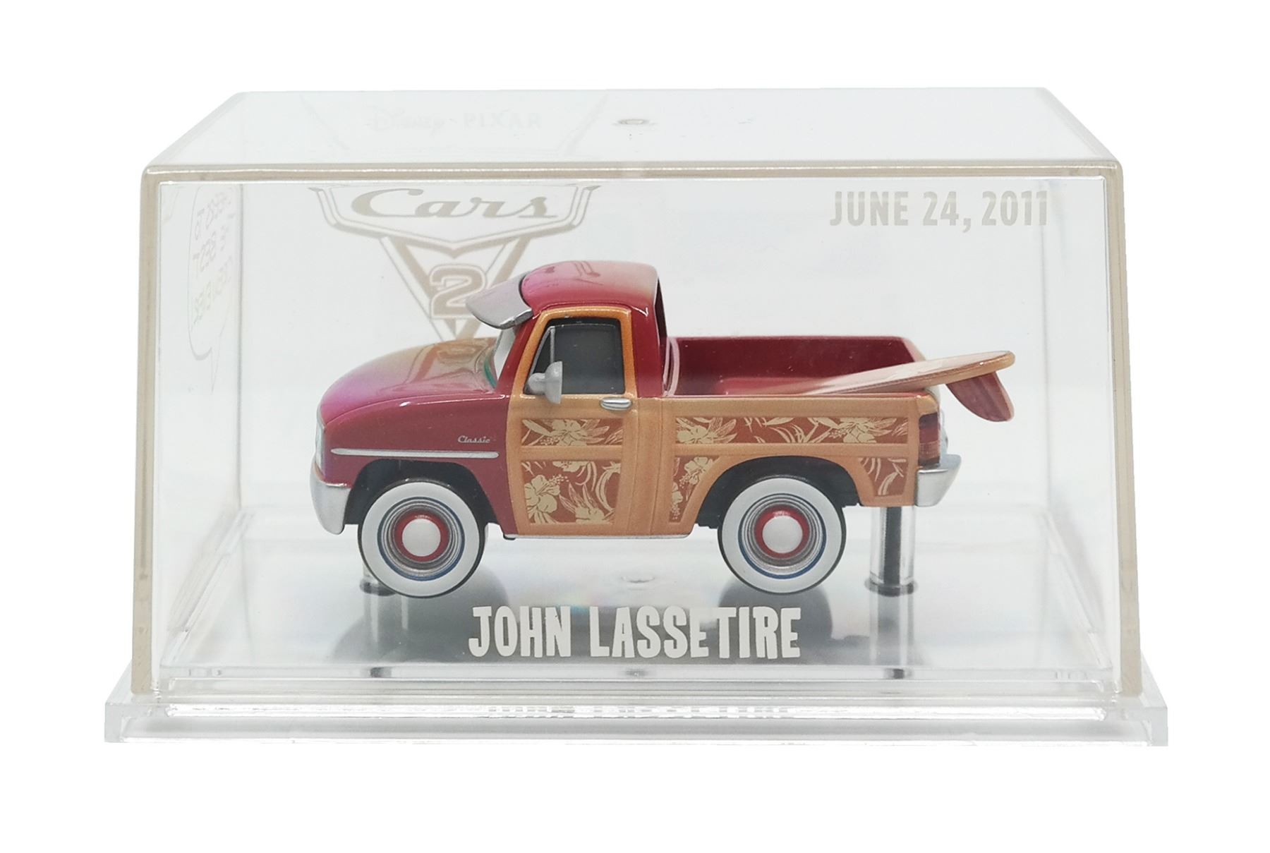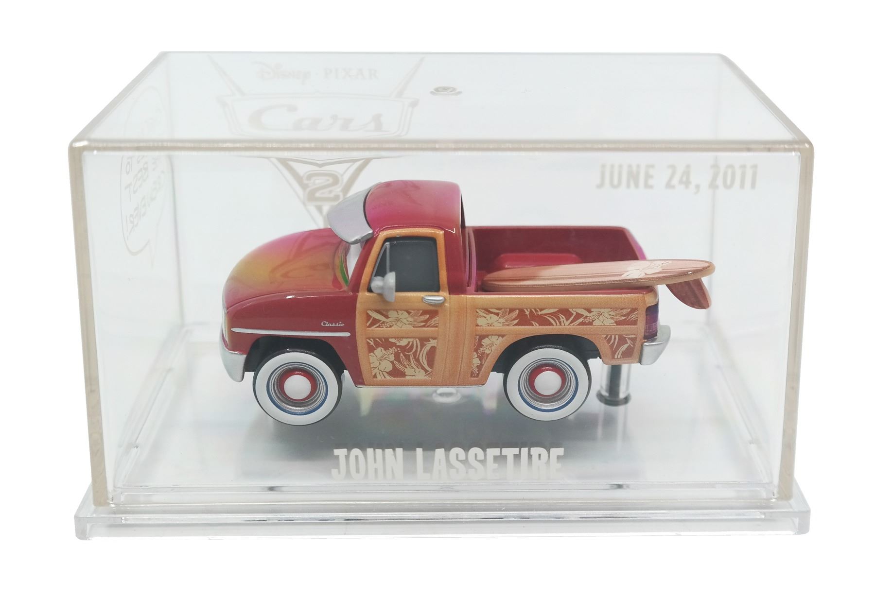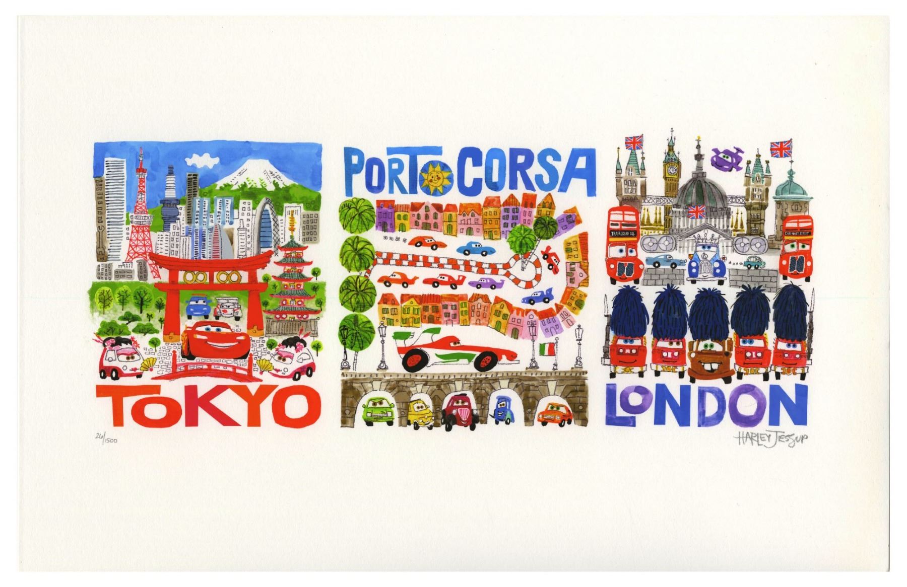 (Pixar, 2011) A pair of crew gifts for Cars 2, including a limited edition print and a "John Lassetire" toy truck in a display box. The beautiful three-scene print is signed by Harley Jessup in the lower-right and is numbered 26/1500. The toy car comes in a plastic case, and honors the film's director, John Lasseter. Measuring 11"x17", the print is in very good condition with little wear. The car is in its original box measuring 2.75"x5" and 3" deep, and is in very good condition, with some minor wear to the cardboard box.