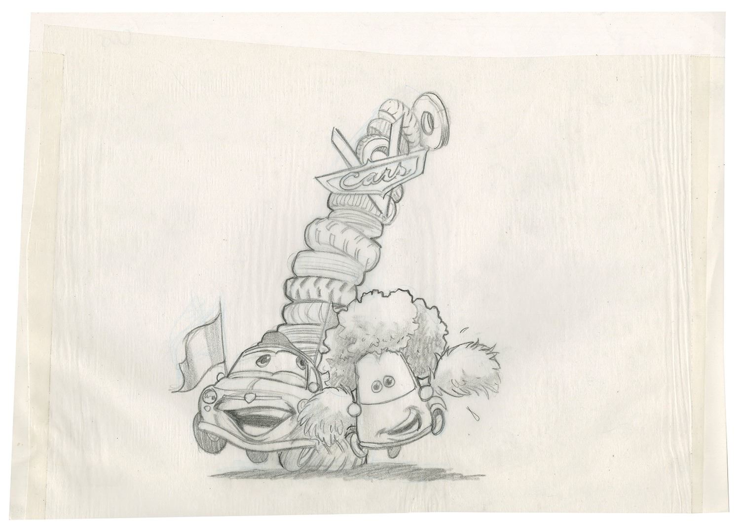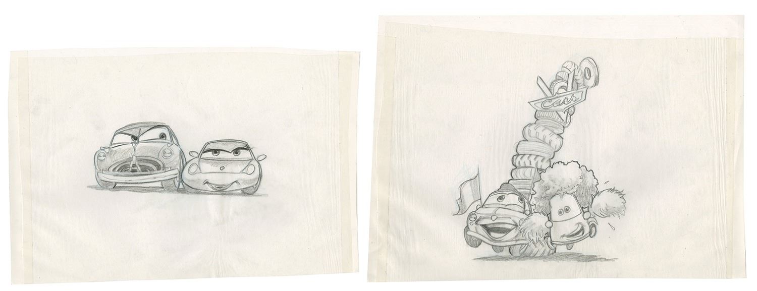 (Pixar, c.2005) A pair of drawings created for Pixar's Cars. The artwork is believed to have been created for posters or other promotional materials for the theatrical release of the film. The drawings depict Doc Hudson and Sally, as well as Luigi and Guido. Accomplished in pencil on vellum that is taped to art paper, the drawings measure 8"x11.75" and 9"x13" on their respective sheets. The condition is very good with minor wear.