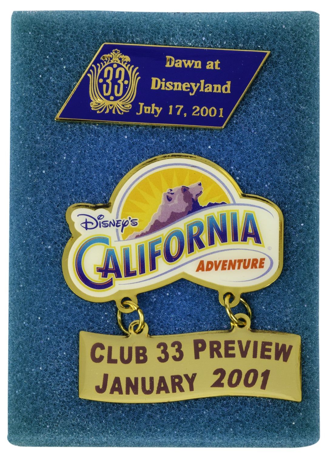 (Disneyland, 2001) A pair of pins from Disneyland's "Club 33". These pins were given exclusively to club members who attended the preview events for California Adventure in January of 2001, and the "Dawn at Disneyland" special event in July of 2001. The pins feature logos for California Adventure and "Club 33", and measure 2"x2" and 0.75"x1.75", respectively. The pair is in very good condition with little to no wear.