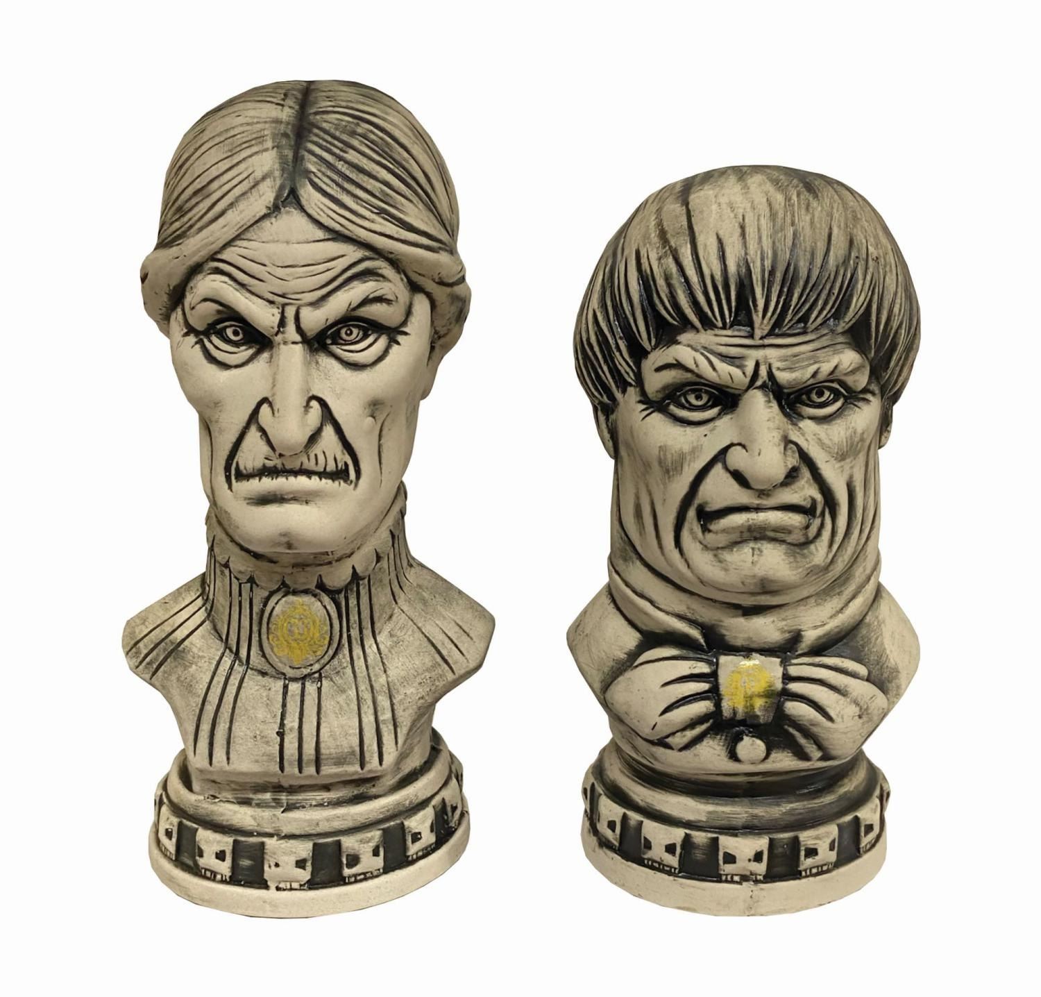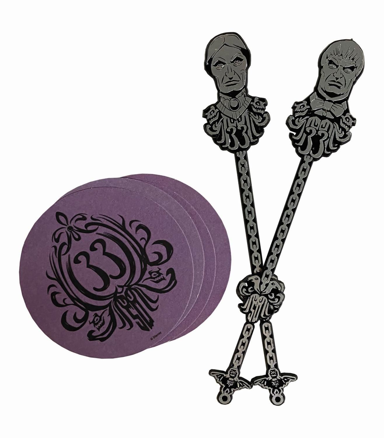 (Disneyland, 2019) A pair of Club 33 exclusive ceramic tiki mugs created to commemorate the 50th anniversary of the Haunted Mansion. Modeled on the busts from the infamous Portrait Hallway, the pair includes a "Short Scowl" male mug and a "Tall Frown" female mug. Both are stamped on the front in glow-in-the-dark ink with a Club 33 logo. The mugs retain their original cardboard box packaging. They are accompanied by (2) matching plastic Club 33 swizzle sticks, and a Club 33 logo shopping bag. The mugs measure approximately 8" tall and 4" in diameter. Everything is in very fine condition being as-new save the swizzle sticks which are in fine condition with some minor rubbing. Â