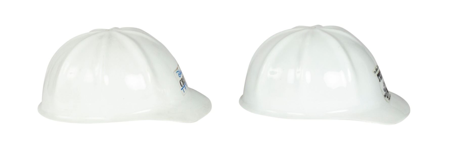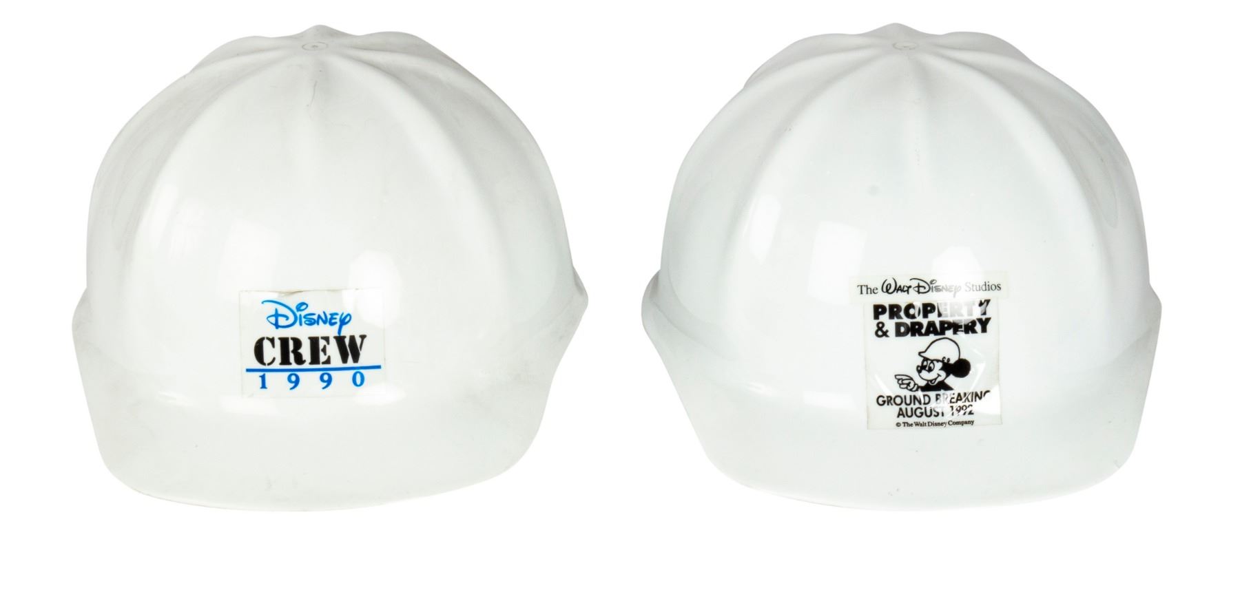 (Walt Disney Studios, 1990-92) A pair of commemorative hard hats from Disney construction projects. These hats were not intended for extended use during construction, but were created specifically for groundbreaking and other project milestones. One of the hats reads "Disney Crew 1990" and the other commemorates the Property & Drapery groundbreaking in August of 1992. The hats are adjustable and have an opening of approximately 8.75"x7.25". Both are in good condition, with some wear to the stickers due to age and some scuffing and marking to the interiors and exteriors.