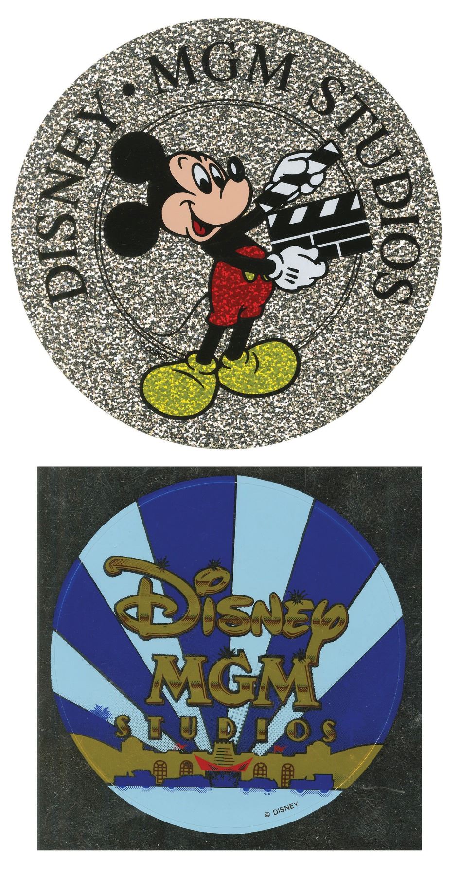 (Disney-MGM, c.1990s) A pair of stickers from Disney-MGM Studios. Featuring excellent Hollywood-inspired imagery, first sticker measures 5" in diameter, and the other measures 4.5"x4.5". Both are in very good unused condition with minor surface wear.