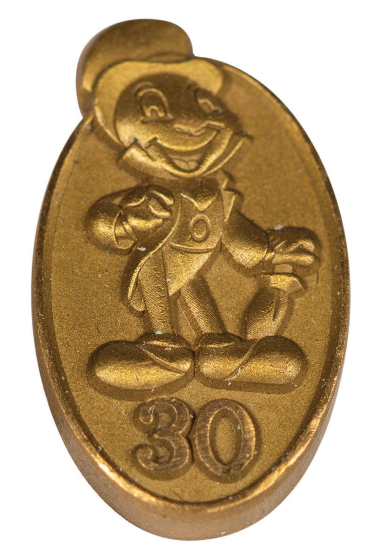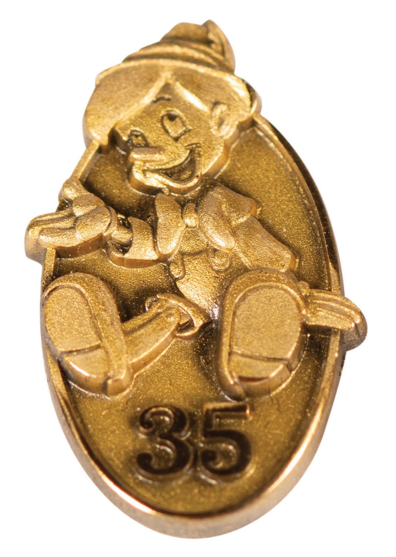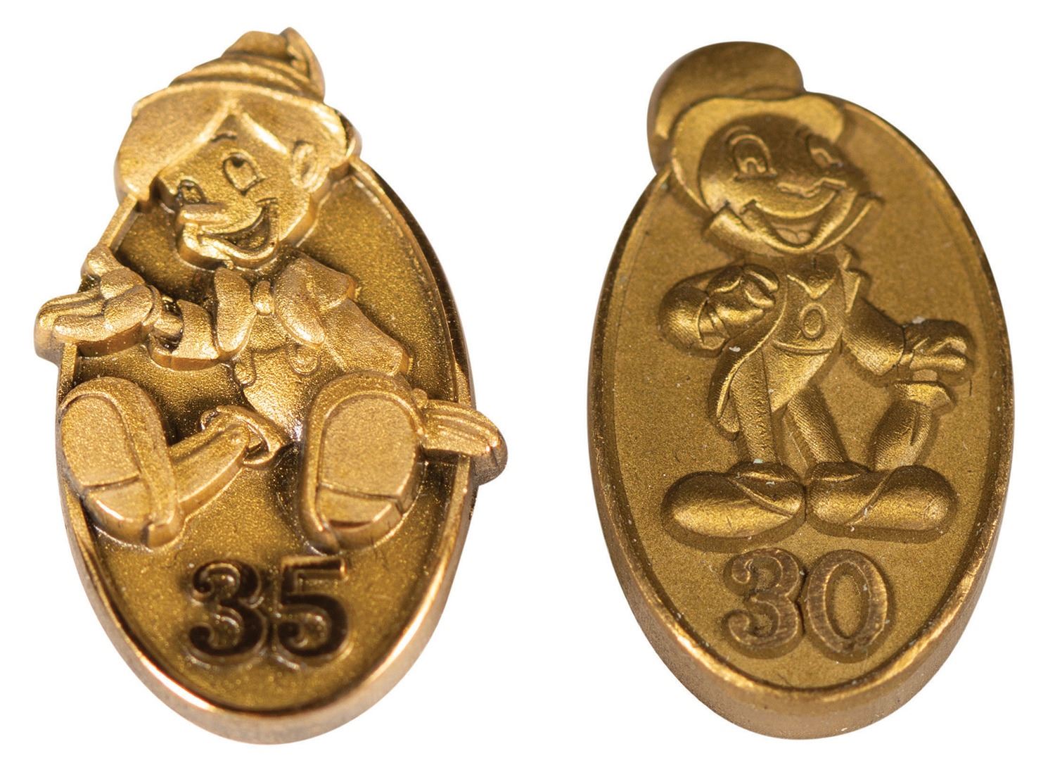 (Disneyland, c.1980s-90s) A pair of Disneyland cast member anniversary lapel pins. The metal relief pins feature (1) Jiminy Cricket and (1) Pinocchio and commemorate 30 years and 35 years of continuous service to the park respectively. Given the extraordinary length of the tenure required for eligibility, these pins are somewhat scarce. They measure approximately 0.75”x0.5” and are presented on a card backing in their original plastic box of issue. Both are in fine condition, exhibiting minimal handling.