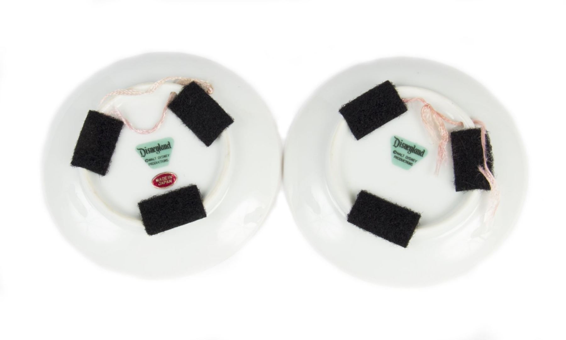 (Disneyland, 1960s) A pair of small decorative plates featuring Disneyland attractions and characters. The plates depict Mickey and Tinker Bell, as well as Donald with the Sailing Ship Columbia. Both plates measure 4" in diameter and are in very good condition with minor wear. Velcro tabs have been applied to the bases for their protection.