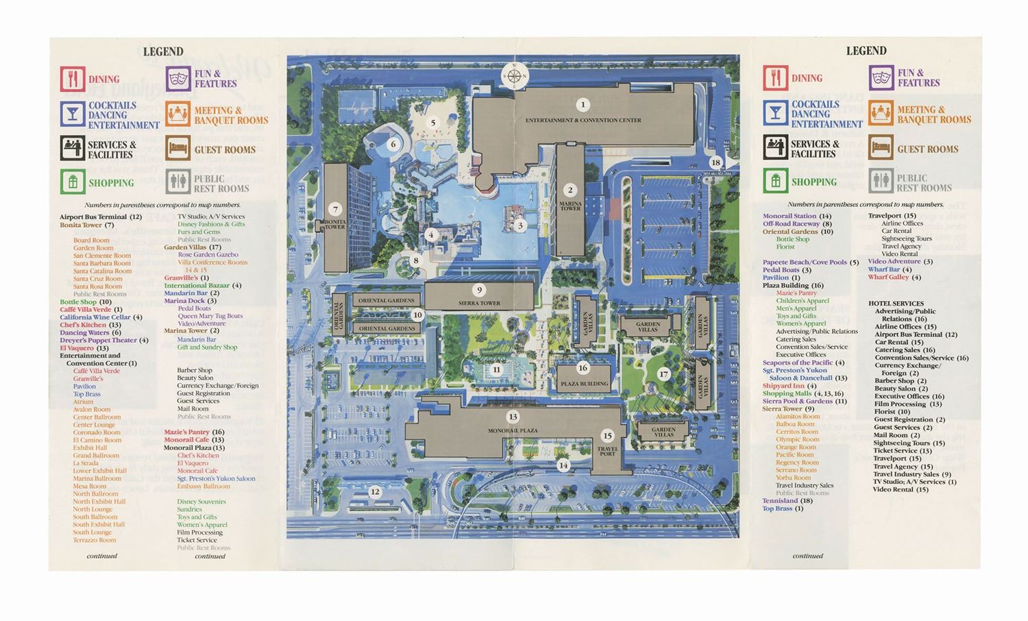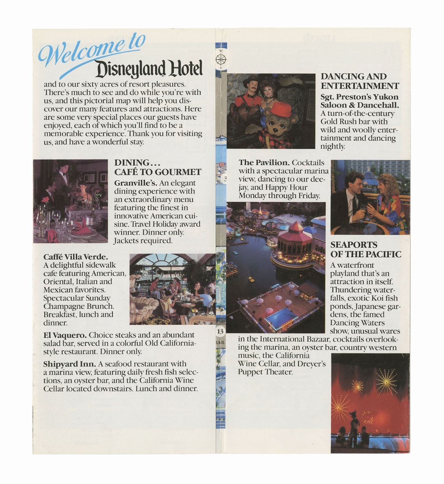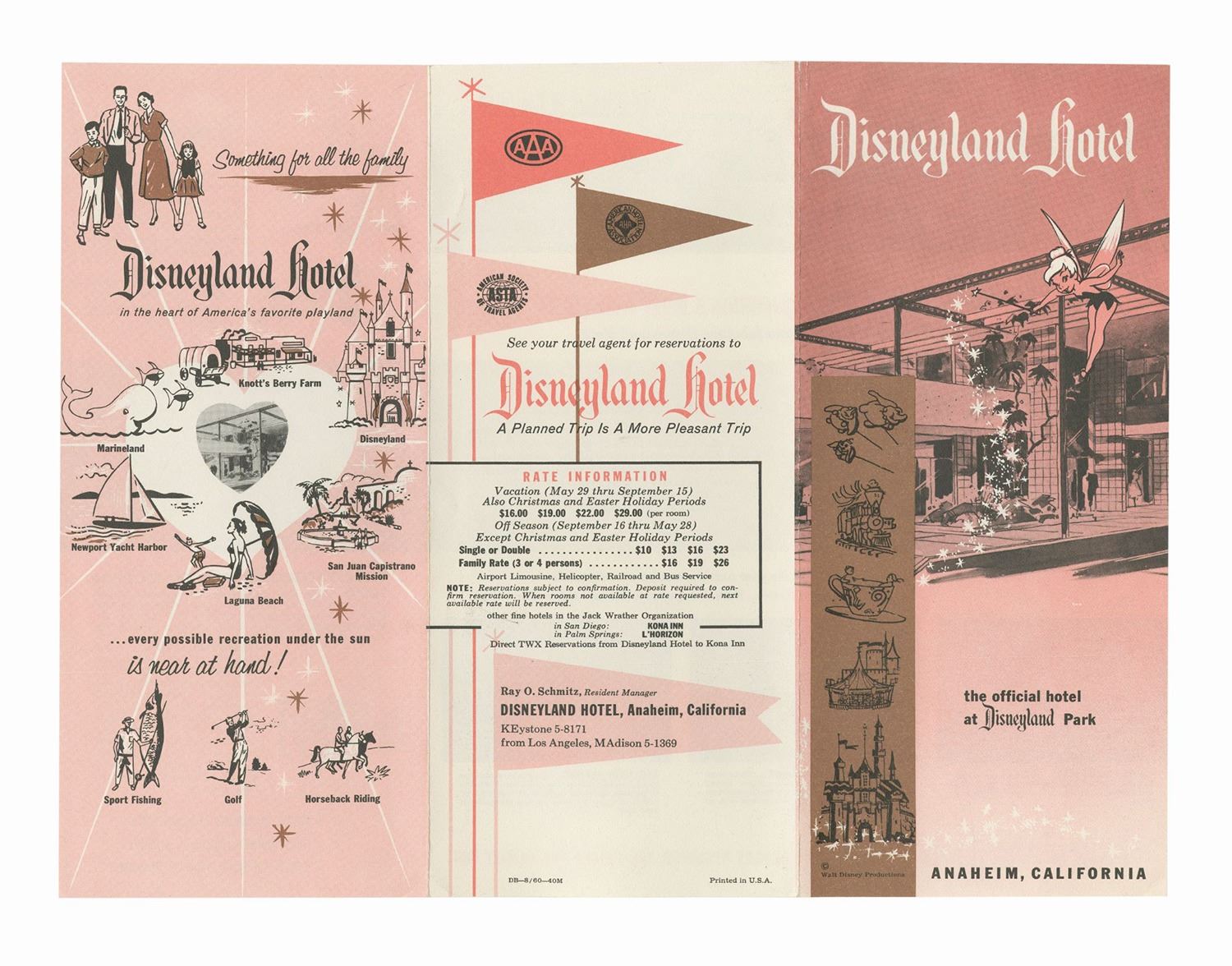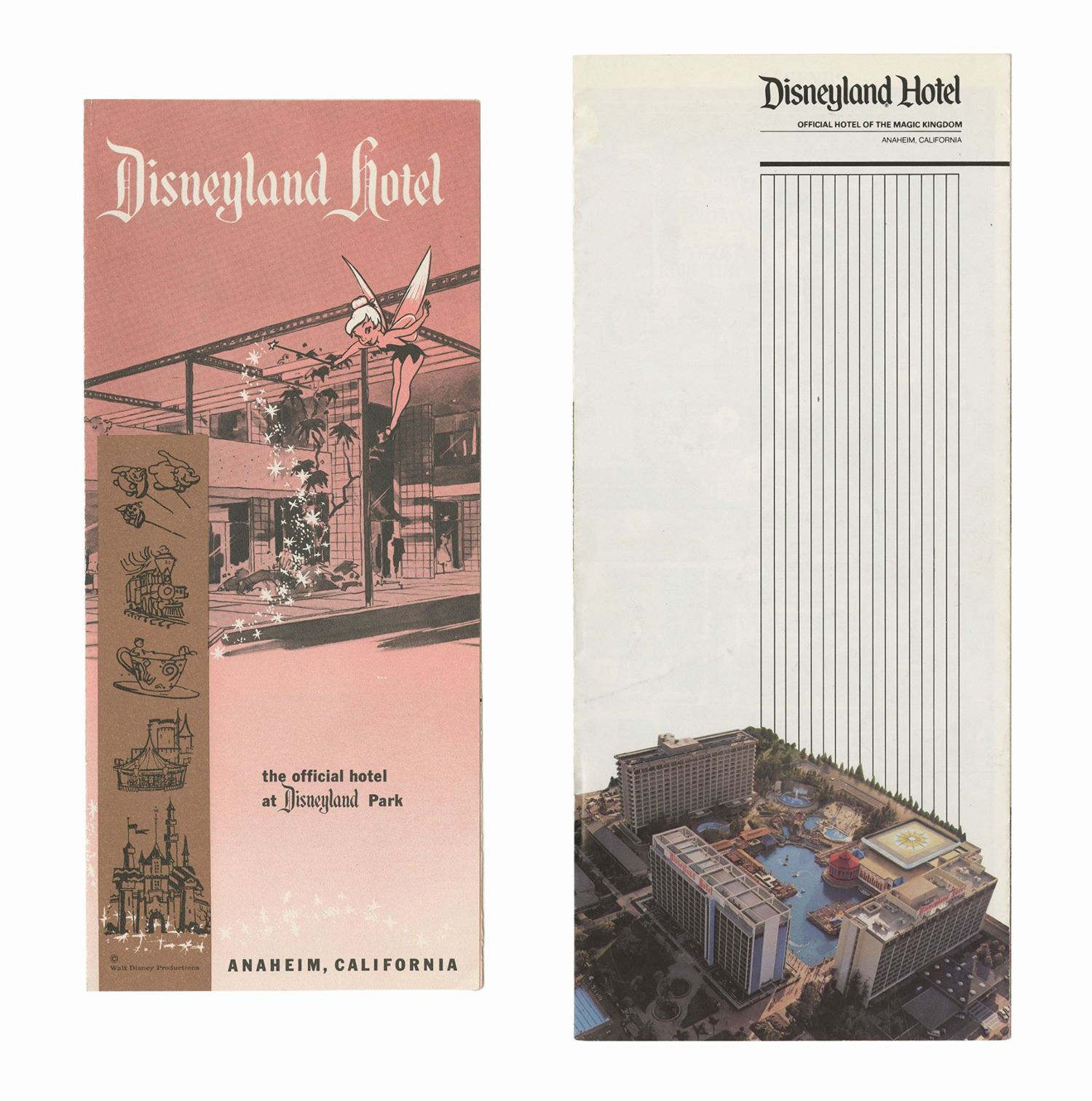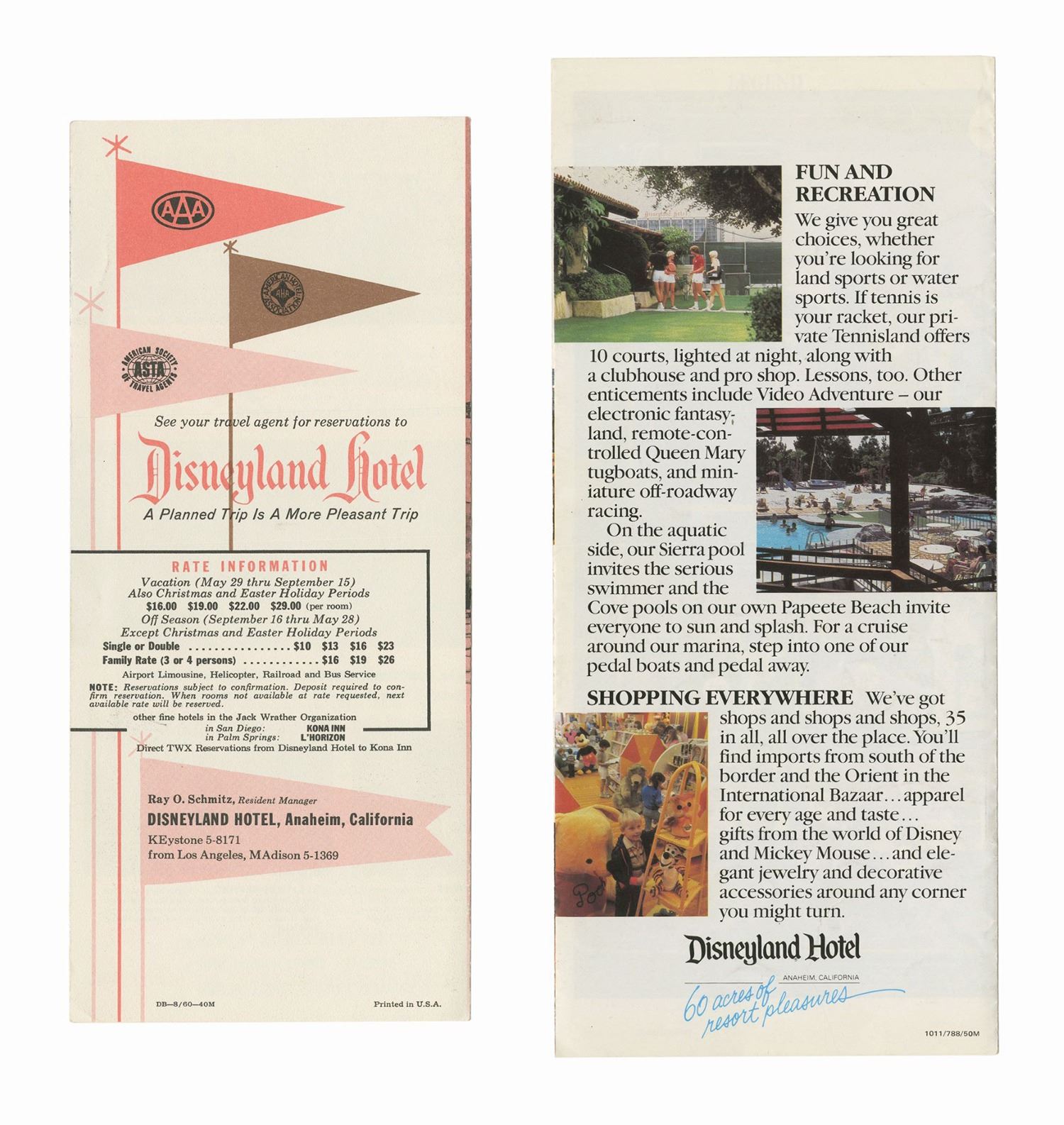 (Disneyland, c.1960/90s) A pair of brochures from the Disneyland Hotel. Contained within is an incredible look into the early years of the hotel and the extent to which it changed over time. The earlier example touts "modern" luxury features such as a TV in every room and a heated Olympic-sized pool, while the later edition contains a map of the vastly expanded hotel grounds. When folded, the brochures measure 9"x4" and 10"x4.5", respectively. They are both in very good condition with minor wear to edges.