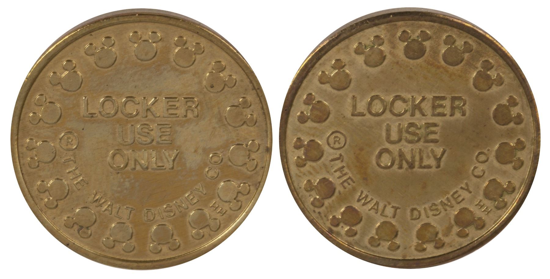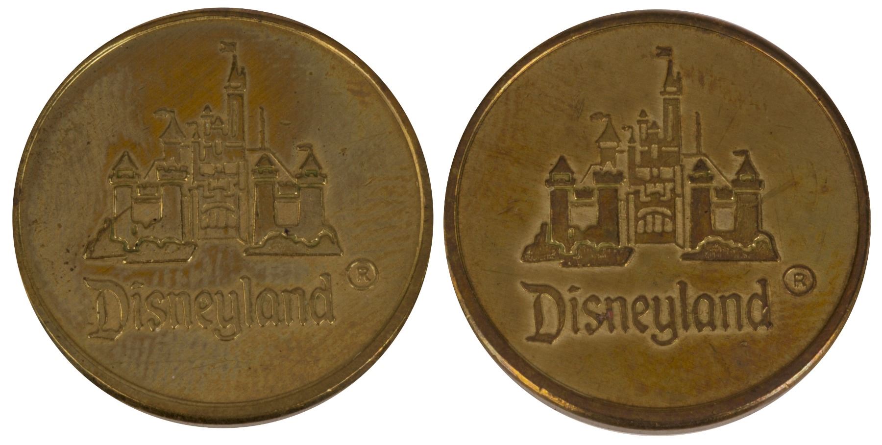 (Disneyland, c.1970s) A pair of locker rental coins from Disneyland that feature Sleeping Beauty Castle on one side, and a Mickey-ear pattern around the rim on the other side. Both coins measure just under 1" in diameter and are in good condition with minor surface wear from use.