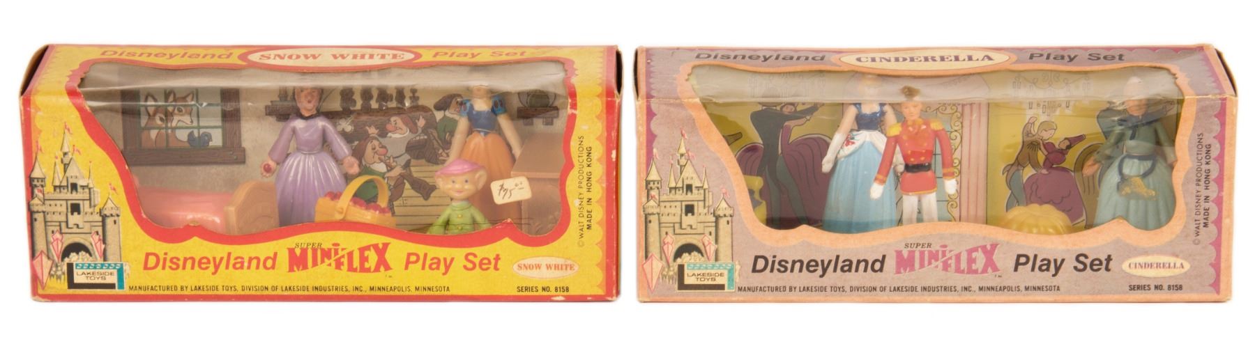 (Disneyland, c.1960s) A pair of Disneyland Miniflex Play Sets based on Cinderella and Snow White. These play sets have deep window boxes containing three figures and plastic accessories. The characters can twist and bend into various poses. Each box includes a beautiful background illustration and measures 3"x8" and 3" tall. The pair is in good condition with some color-wear and wear to the edges of the boxes.