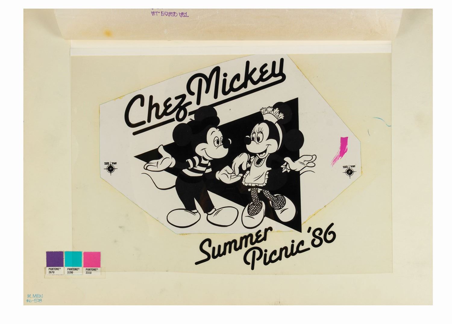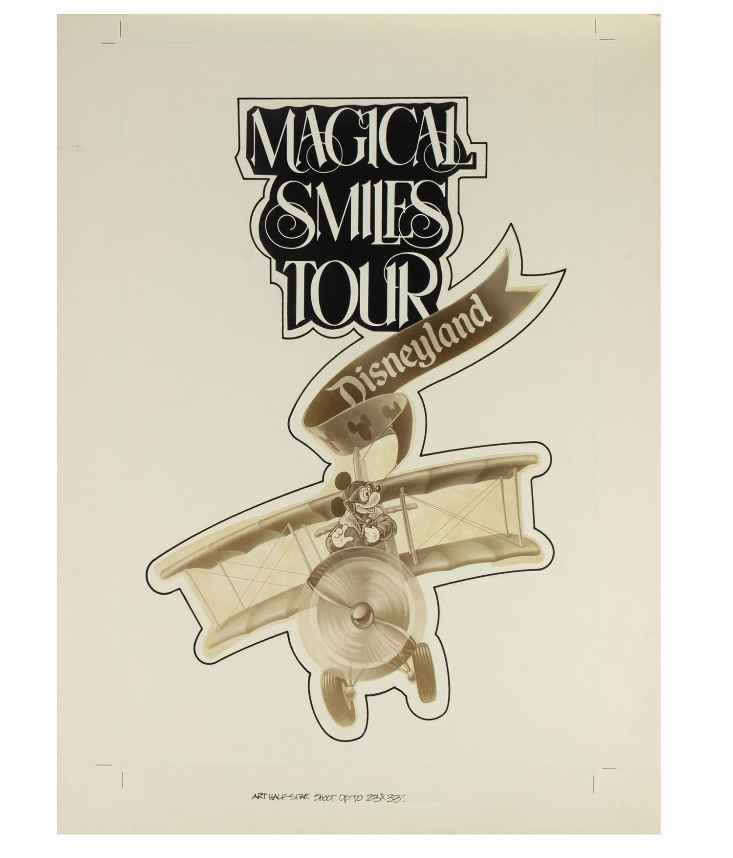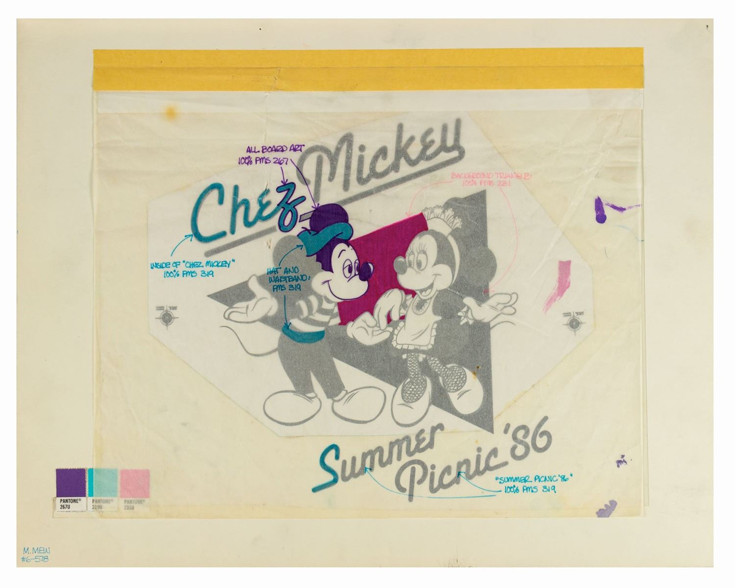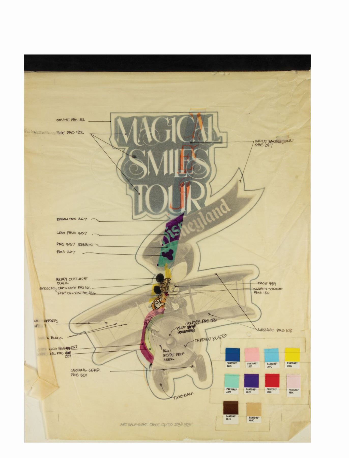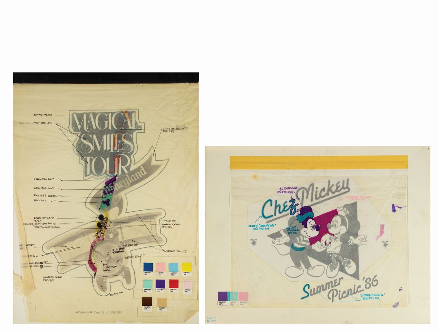 (Disneyland, c.1986) A pair of original design comps used in the creation of promotional imagery for the Magical Smiles Tour and the a Summer Picnic in 1986. The comps feature printed black line art with hand-colored overlays showing how the final artwork should be colored. The Magical Smiles Tour comp measures 20"x15" while the other comp measures 14"x18". The condition is good overall with some wear and small tears to the vellum overlays.