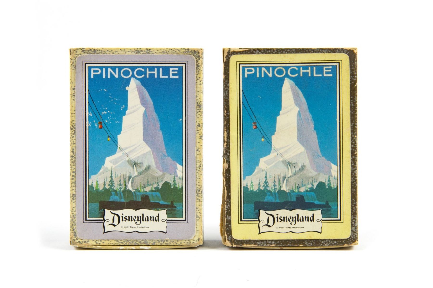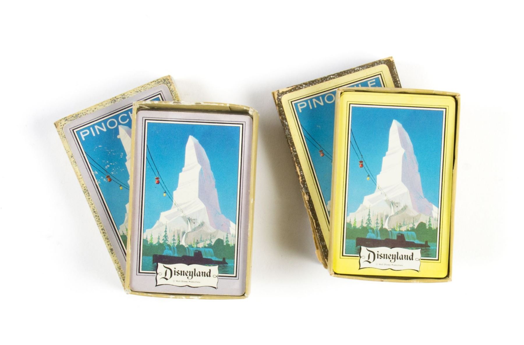 (Disneyland, c.1960s) A pair of decks of Disneyland playing cards. The cards feature Matterhorn and Skyway imagery on the back sides, and the Aces of Spades note that the cards were published by Disneyland. These are Pinochle decks, which contain two copies each of the 9, 10, jack, queen, king, and ace cards for all four suits. The decks measure 3.75"x2.5" and are complete and in very good condition.