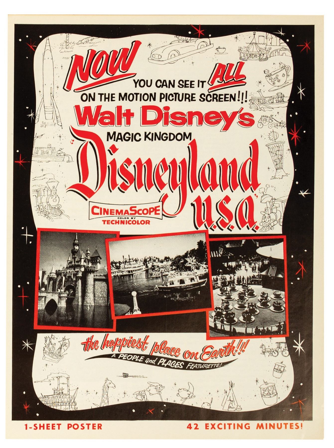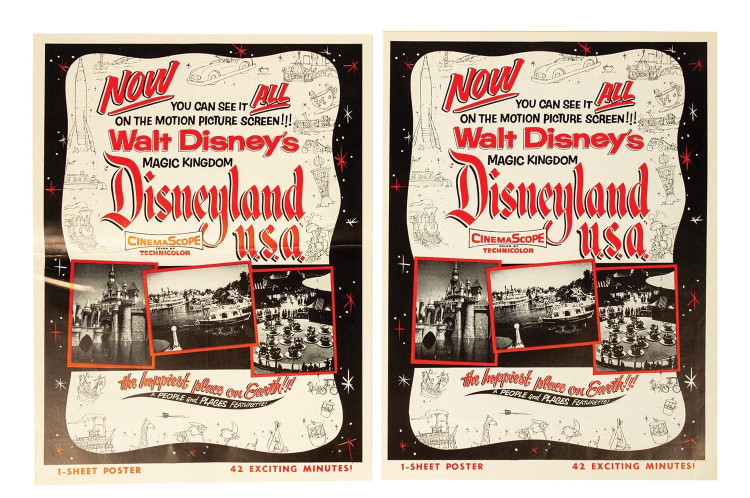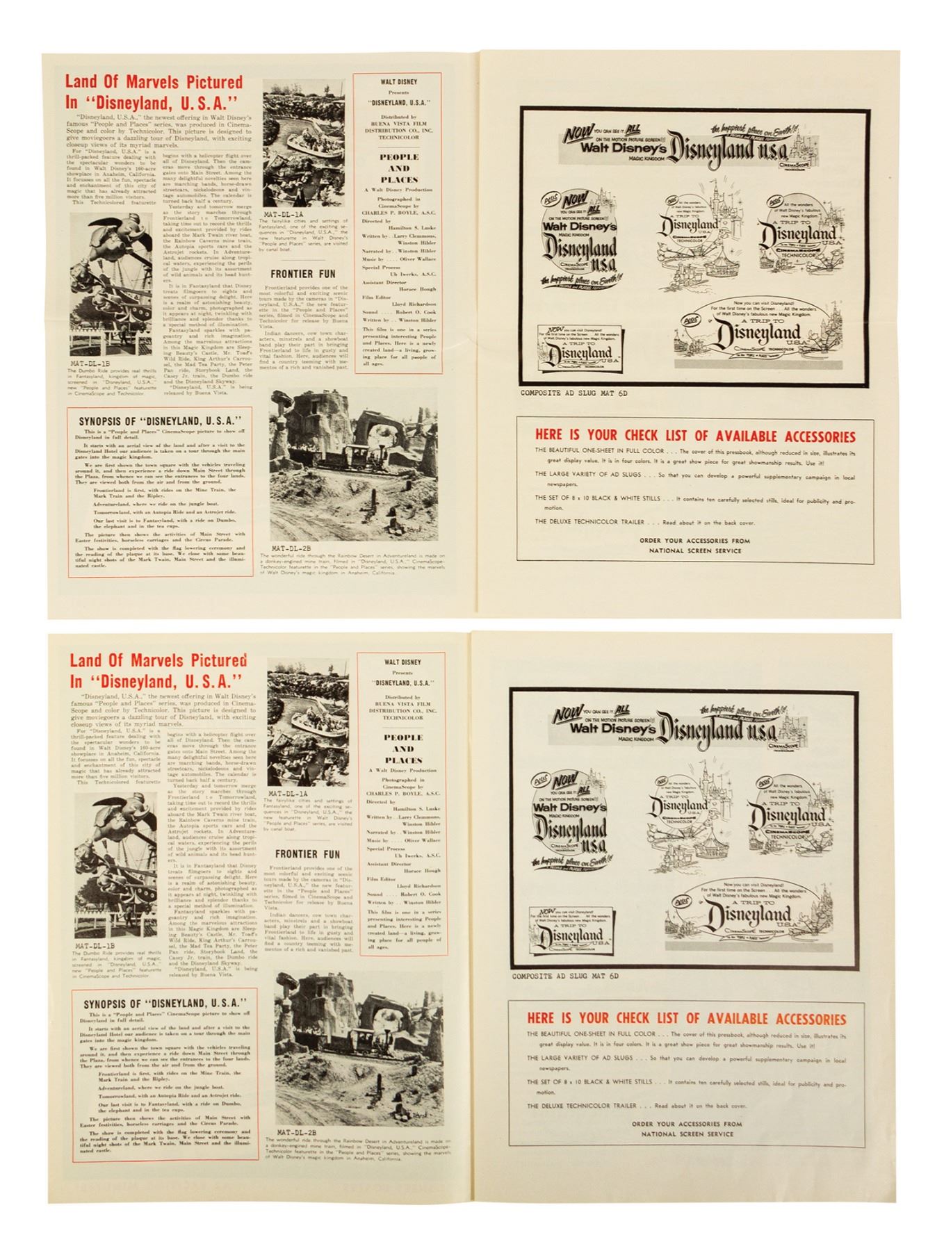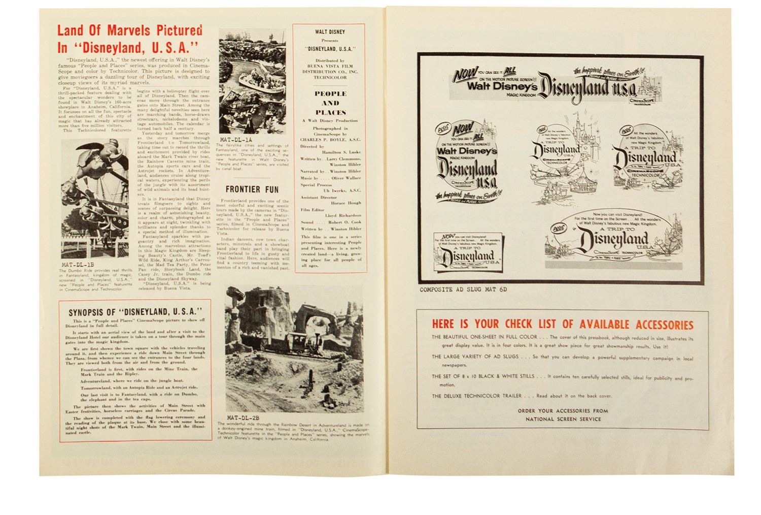 (Disneyland, c.1957) An original marketing brochure for Disneyland USA, a cinemascope featurette that played in select theaters nationwide to promote the newest attractions at Disneyland. Prior to the 1980s, movie posters were produced specifically for theaters and stores to promote the release of films to consumers. An organization called National Screen Service handled the distribution of these promotional materials for the distribution companies, and they would provide theaters with brochures like this. It would have a synopsis of the film and a variety of promotional materials that could be ordered for display in their theater to promote the release of the film. Measuring 12.75"x9.5", the tri-fold brochures are in good condition overall, with one having a crease across the center and edge-wear from use.