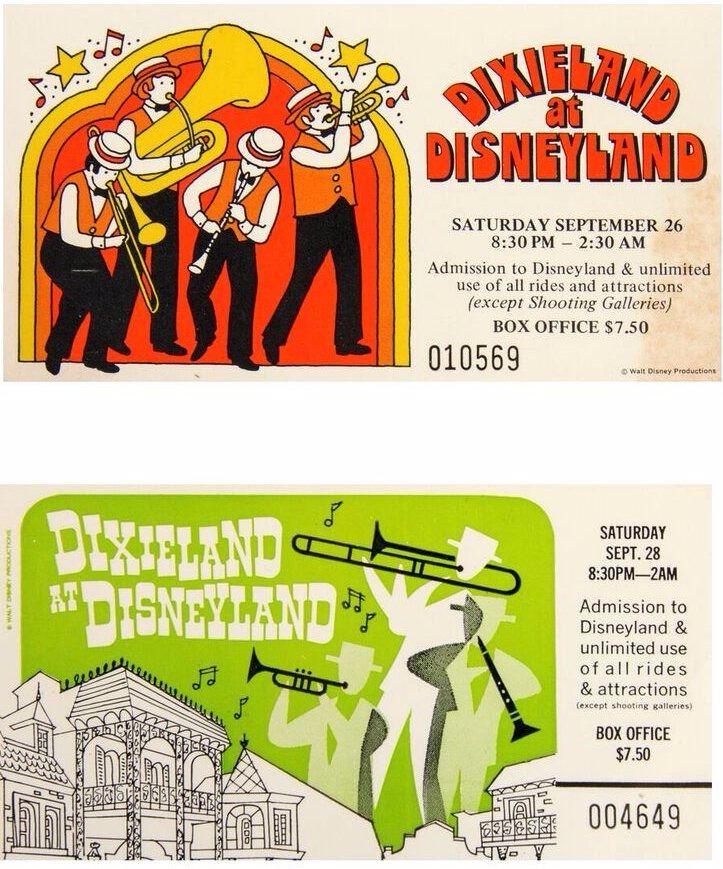 (Disneyland, 1968/70) A pair of tickets for the special "Dixieland at Disneyland" events at Disneyland for the years 1968 and 1970. The tickets feature great imagery of musical performers at Disneyland on the front and list refund information on the back. Both tickets measure 2.5"x4.75" and the pair is in good condition with minor edge-wear and a spot of discoloration in the corner of the 1970 ticket.